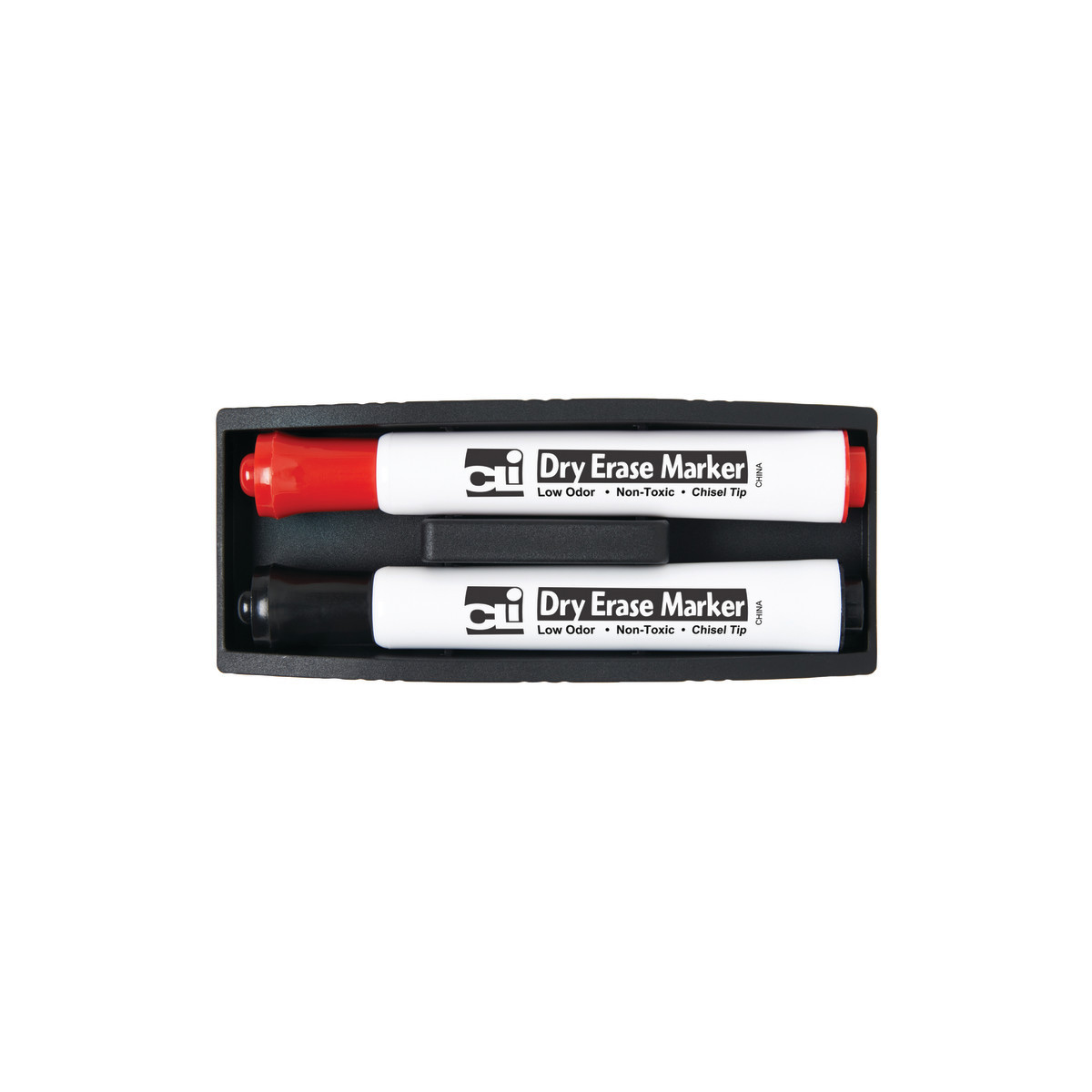 Our magnetic whiteboard eraser has a sleek space saving design that allows you to also store two markers. The eraser clings securely to all magnetic surfaces and removes markings from all dry erase surfaces. Eraser comes with two Barrel, chisel tip markers that are AP Certified, non-toxic, conform to ASTM D4236.