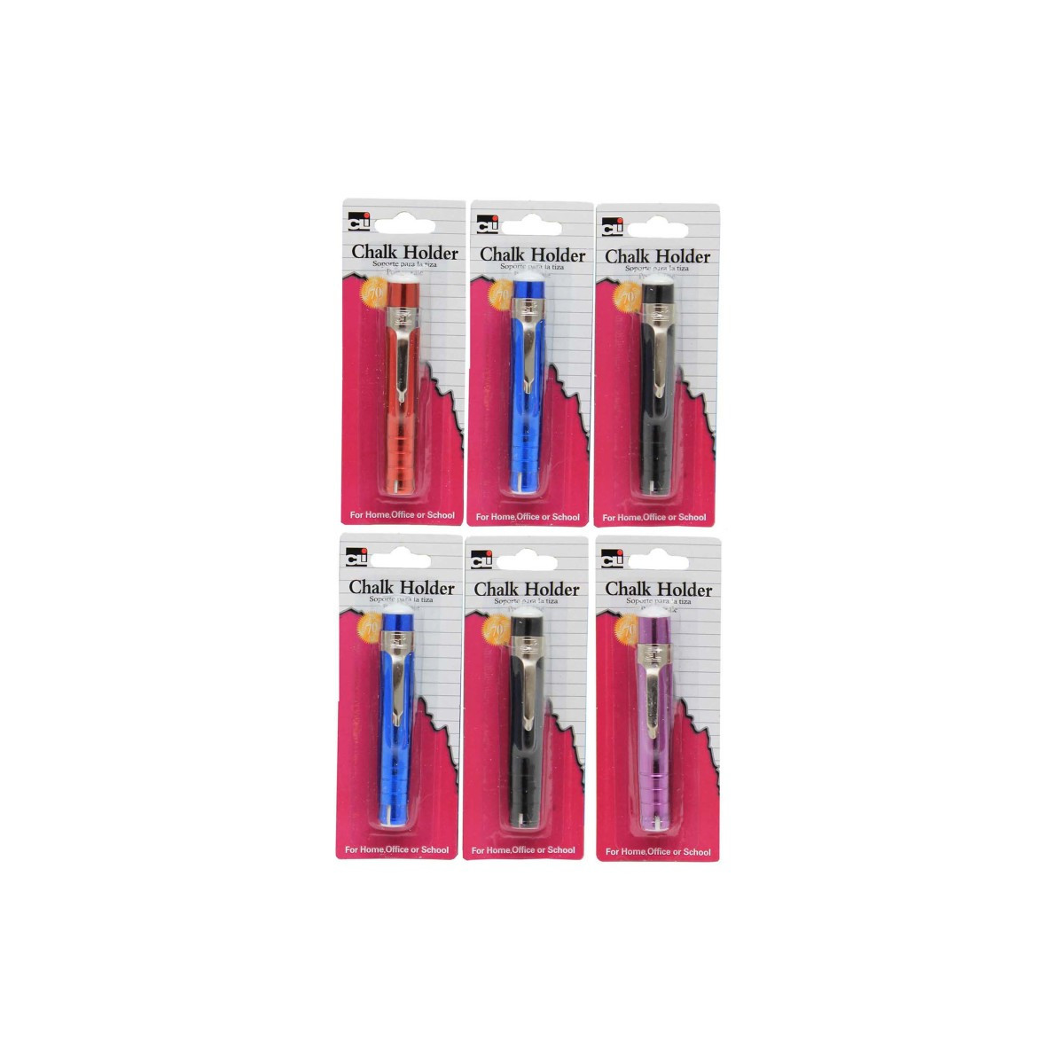 Aluminum easy-to-use chalk holder prevents chalk breakage, keeps hands clean. Features handy pocket clip. Holds standard 0.38" chalk; includes one piece of chalk. Pack of 6 chalk holders in assorted colors (no color choice).