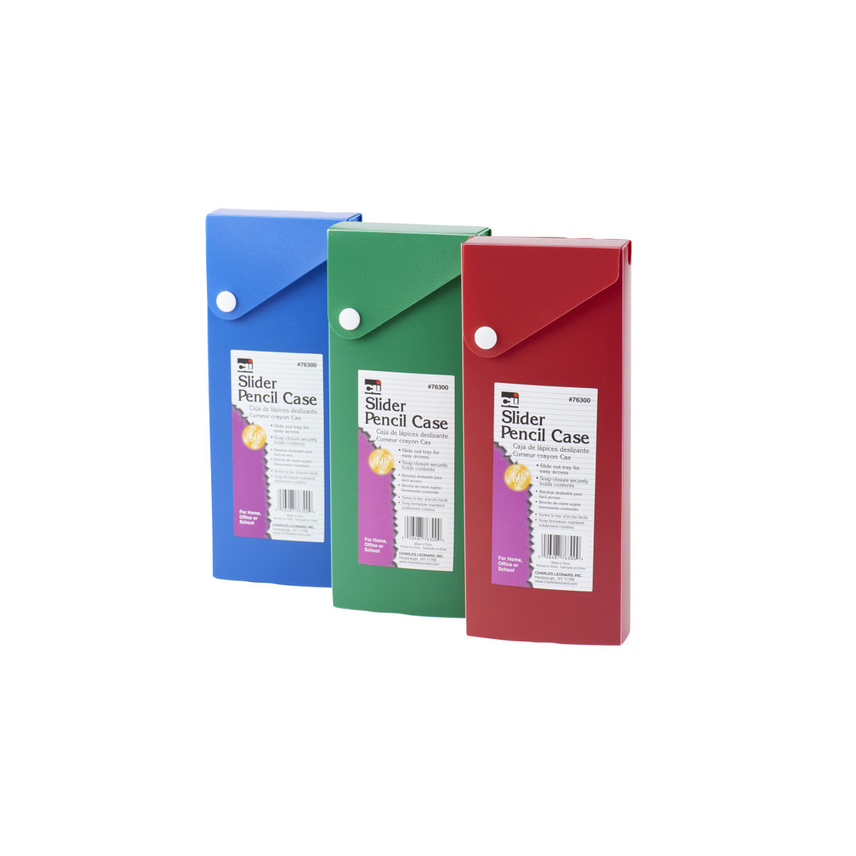Slider Pencil Box allows for easy access. Complete with snap closure, these stylish boxes can fit anywhere. Pack of 24 pencil boxes in blue, red and green.