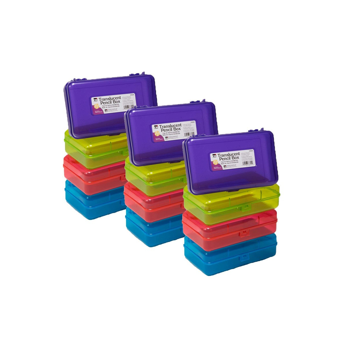 Hold all your school supplies in this large pencil box. These stylish boxes come in translucent assorted colors, letting you see the contents from any angle with ease. Pencil box is 8-1/4" wide, 5-1/4" deep and 2-1/2" high. Sold as a pack of 12 in assorted colors (no color choice).