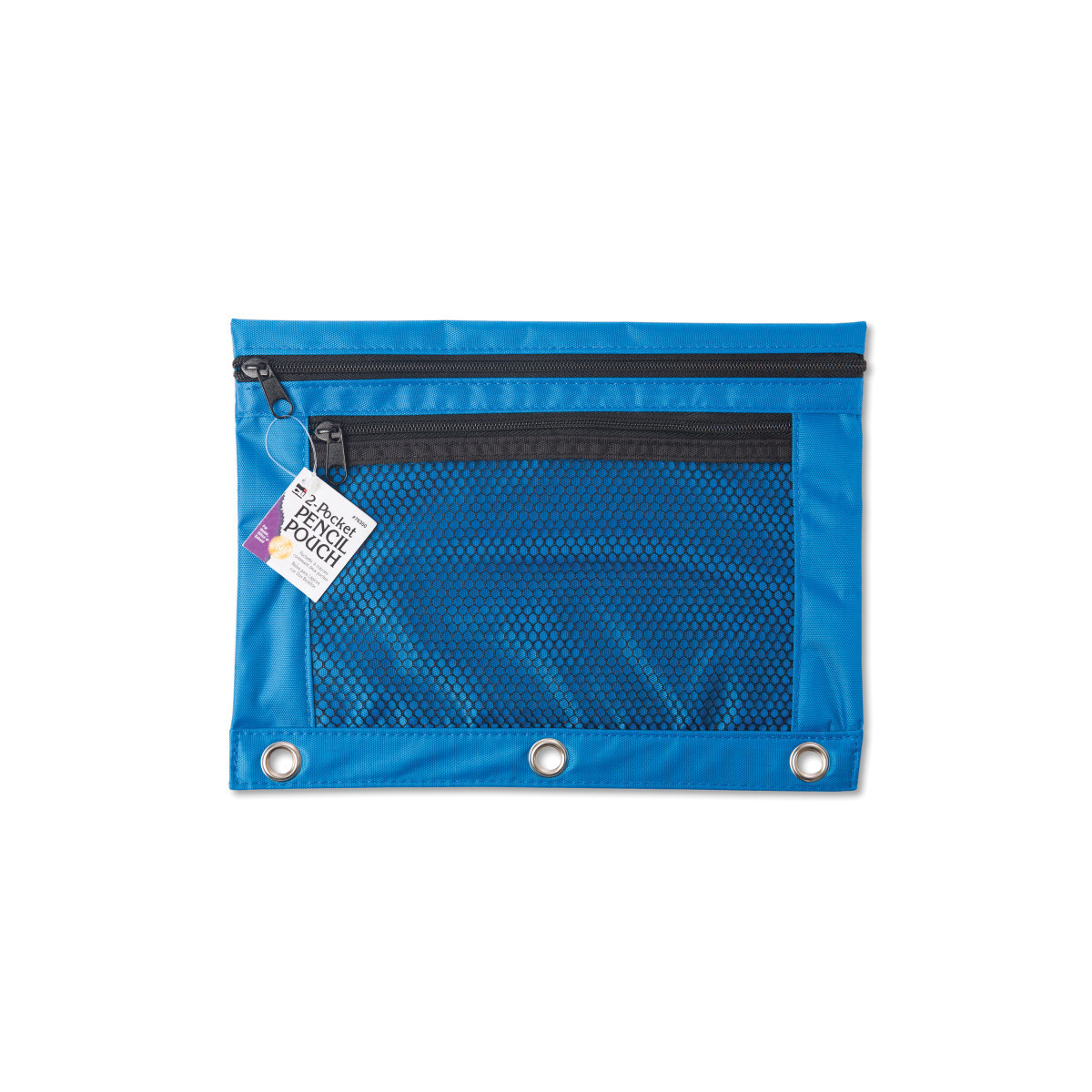 Double pocket pencil pouch, has a mesh front for easy viewing. Fits easily into a 3 ring binder and has reinforced grommet holes. Durable construction for long lasting use. Sold in assorted colors: black, blue, purple and green (no color choice).