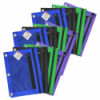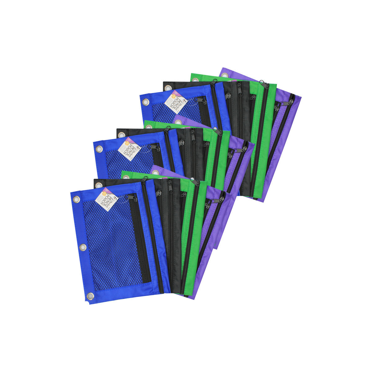 Double pocket pencil pouch, has a mesh front for easy viewing. Fits easily into a 3 ring binder and has reinforced grommet holes. Durable construction for long lasting use. Sold in assorted colors: black, blue, purple and green (no color choice). Pack of 12 pencil pouches.