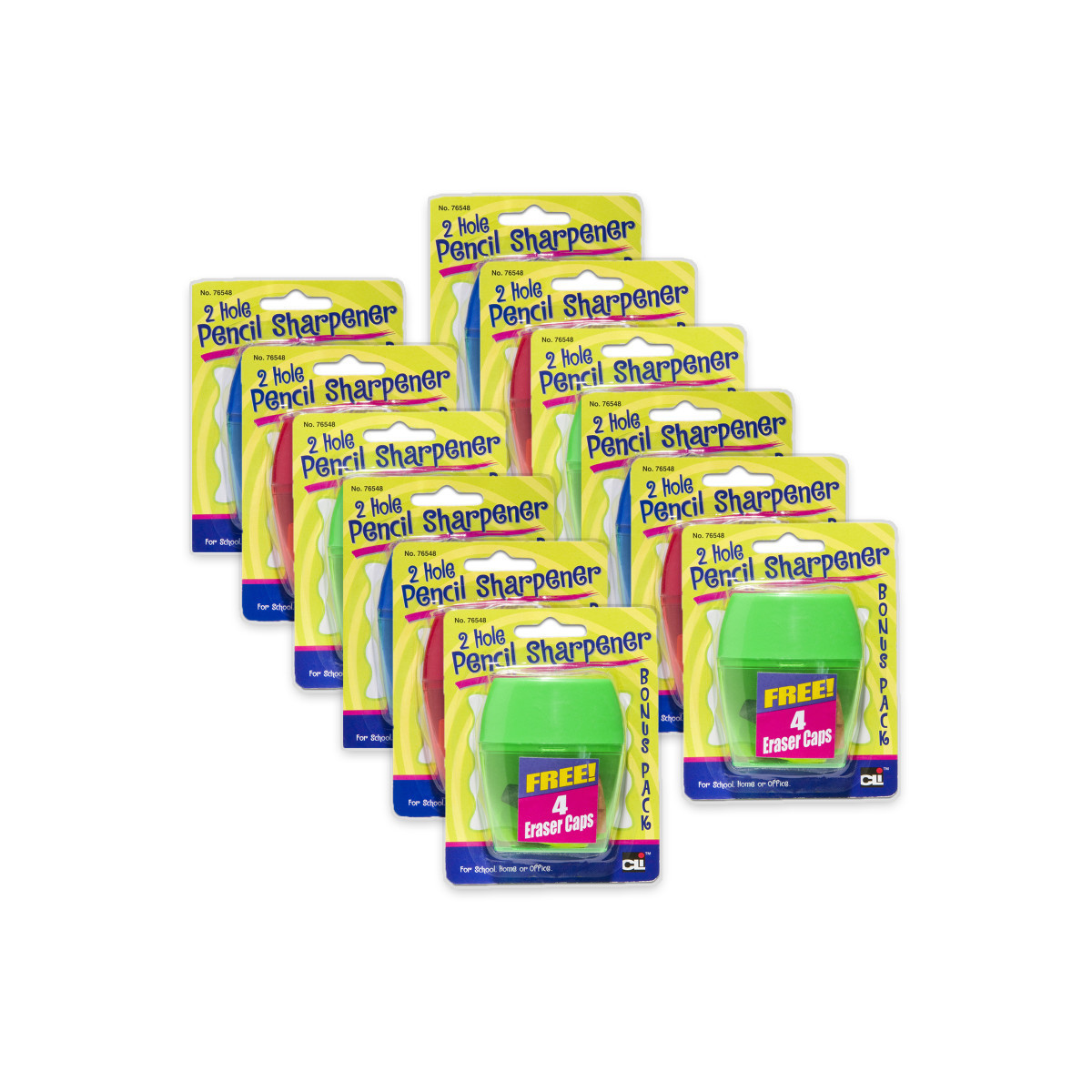 2-hole model sharpens standard, and jumbo size pencils. Deluxe sharpeners feature receptacle for pencil shavings. Comes with 4 free Eraser Caps. 1/Cd, Asst Colors on Sharpeners and Caps.