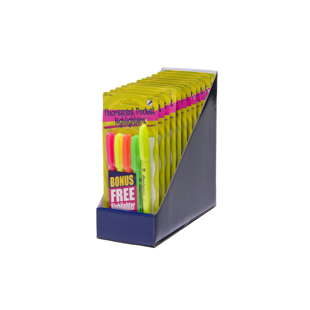 Pocket Highlighters come in bright, see-through colors for easy readability. Chisel tipped for fine lines and easy marking. Quick drying, Non-toxic and conforms to ASTMD. Each pack includes with 4 assorted colors plus 1 free yellow highlighter. Sold as a set of 12 packs for a total of 60 highlighters.