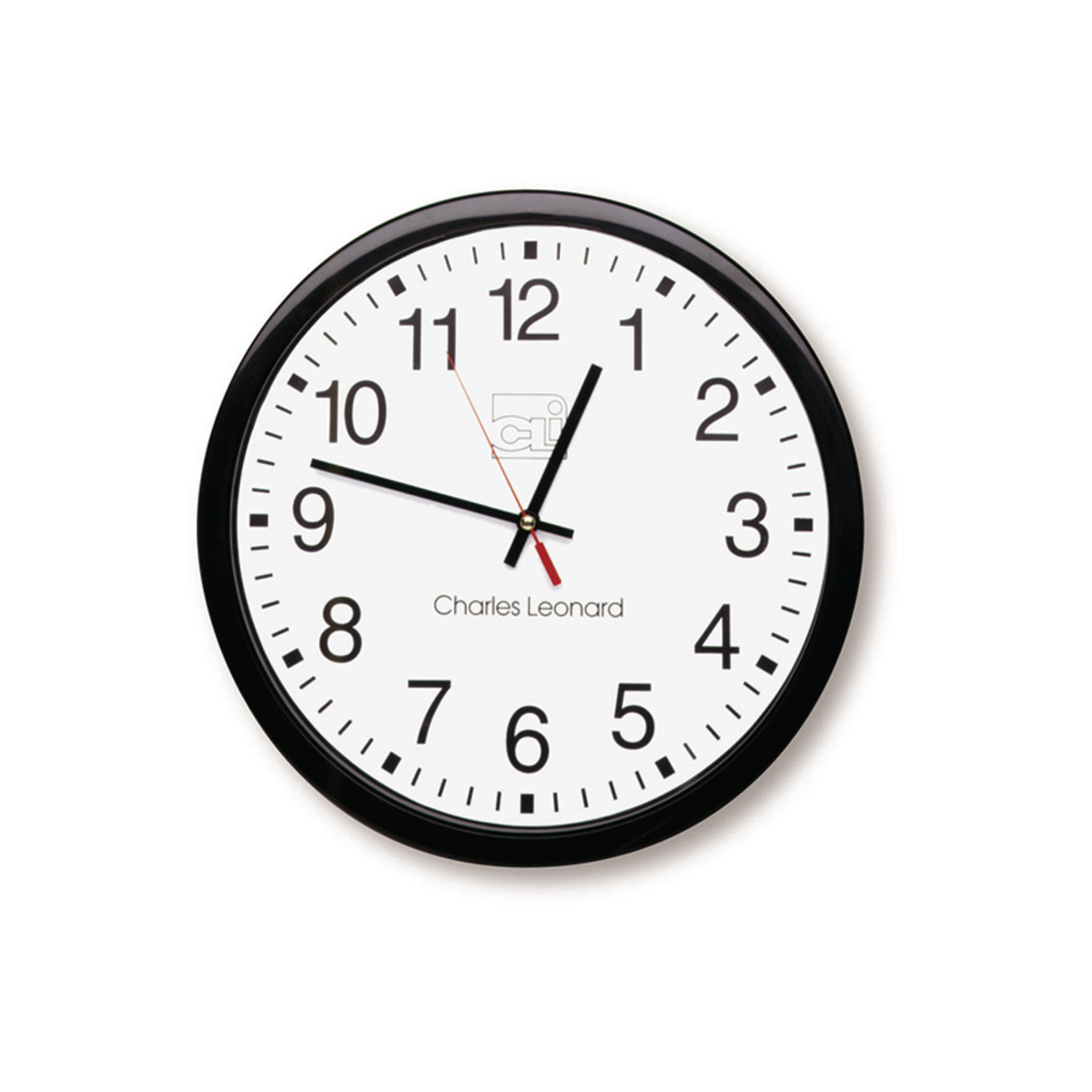 Precise quartz movements to guarantee accurate time. Large, black numerals against white face provide easy viewing. Black, plastic case with clear, plastic lens. Measures 13-7/8" diameter, 12" face, 1-3/4" deep. Requires 1 "AA" battery, (not included).