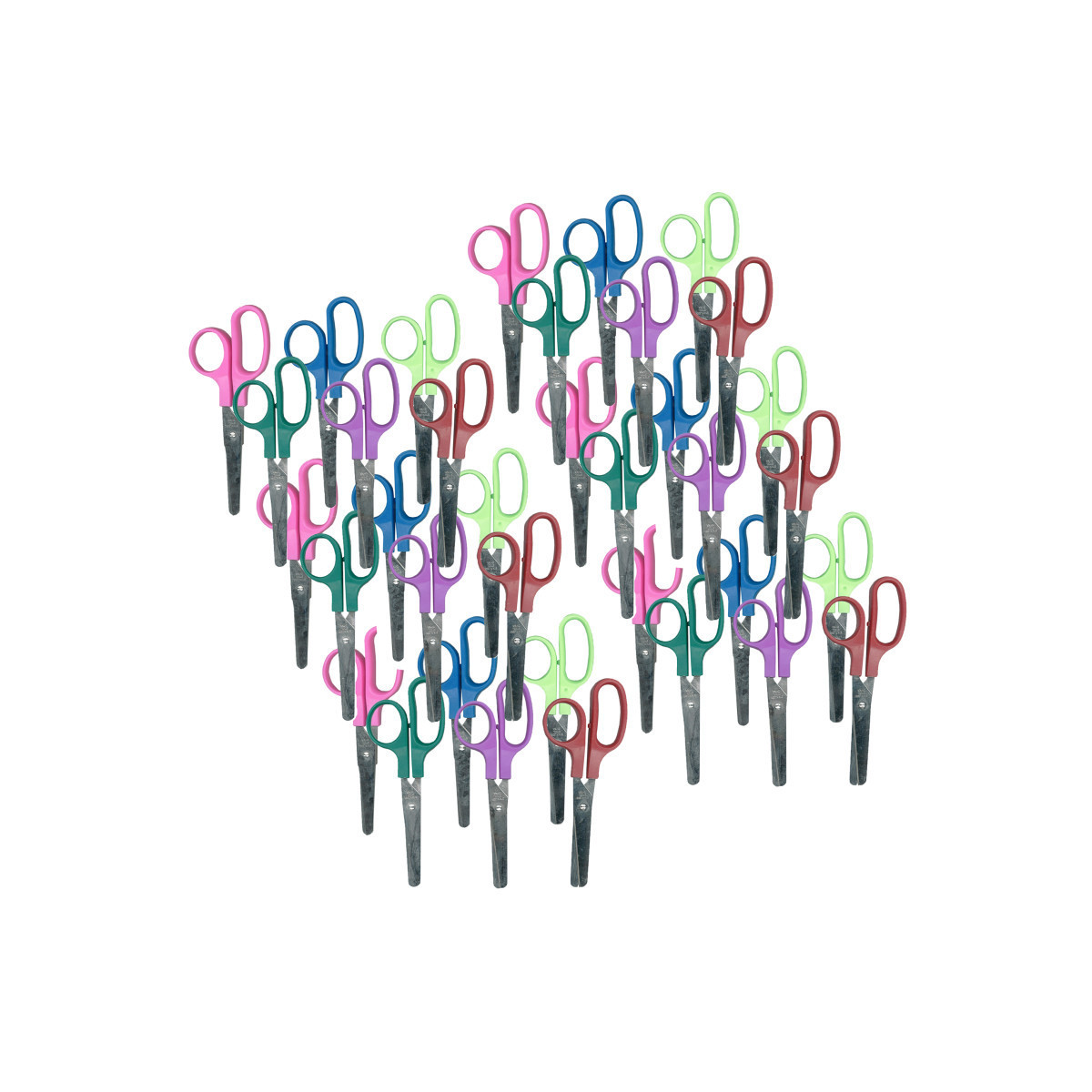 Easy to hold scissors for small hands. Handles have one oblong side to allow better control. Universal design is ideal for both right and left handed use. Stainless steel blades with molded plastic handles. Blunt tip, available in assortment of red, blue and fuchsia (no color choice). Pack of 36 scissors.