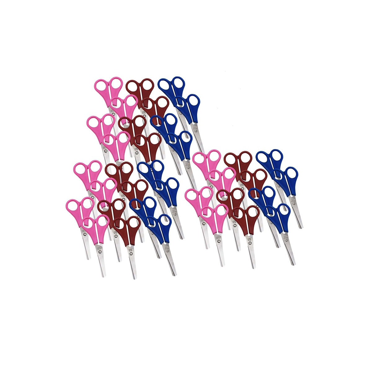 Easy to hold scissors for small hands. Stainless steel blades with molded plastic handles. Universal design is ideal for both right and left handed use. Blunt tip, sold in red, blue and fuchsia (no color choice). Pack of 36 scissors.