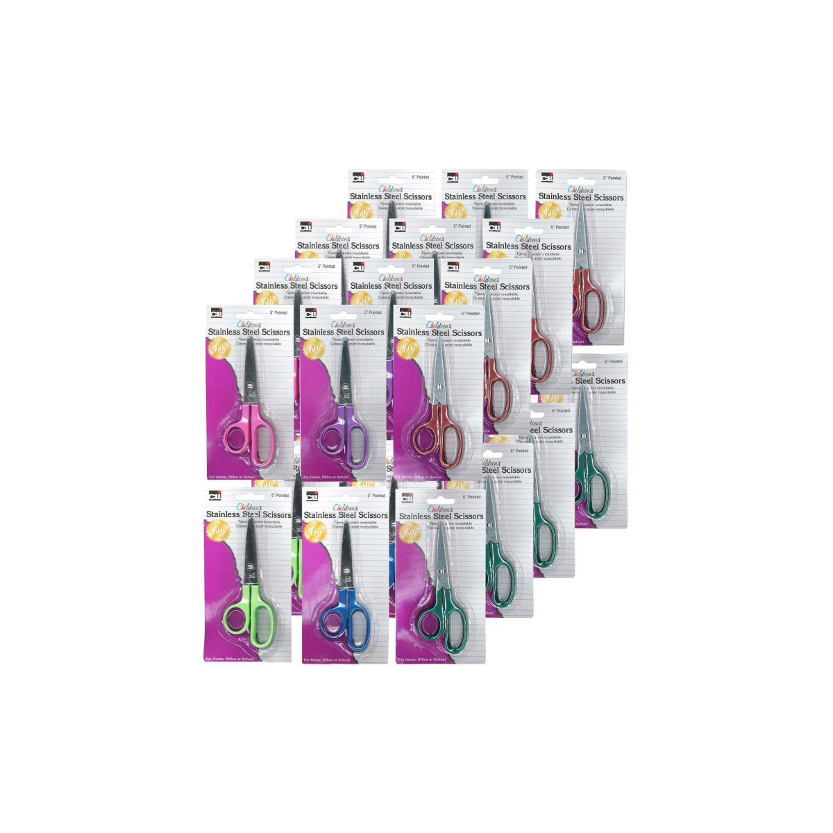 Easy to hold scissors for small hands. Handles have one oblong side to allow better control. Universal design is ideal for both right and left handed use. Stainless steel blades with molded plastic handles. Pointed tip, available in assortment of red, blue and fuchsia. Pack of 24 scissors.