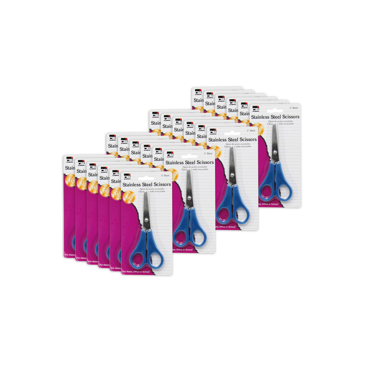 Easy to hold scissors for small hands. Stainless steel blades with molded plastic handles. Universal design is ideal for both right and left handed use. Blunt tip, available in assortment of red, blue and fuchsia (no color choice). Pack of 24 scissors.
