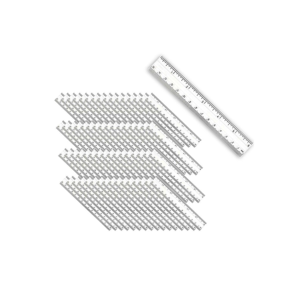 Durable plastic rulers feature double beveled edge with pencil groove. Raised calibrations show 1/16 inches on one edge, millimeters on the other. Holes allow for storage in ring binders. Clear plastic. Sold as a pack of 48 rulers.