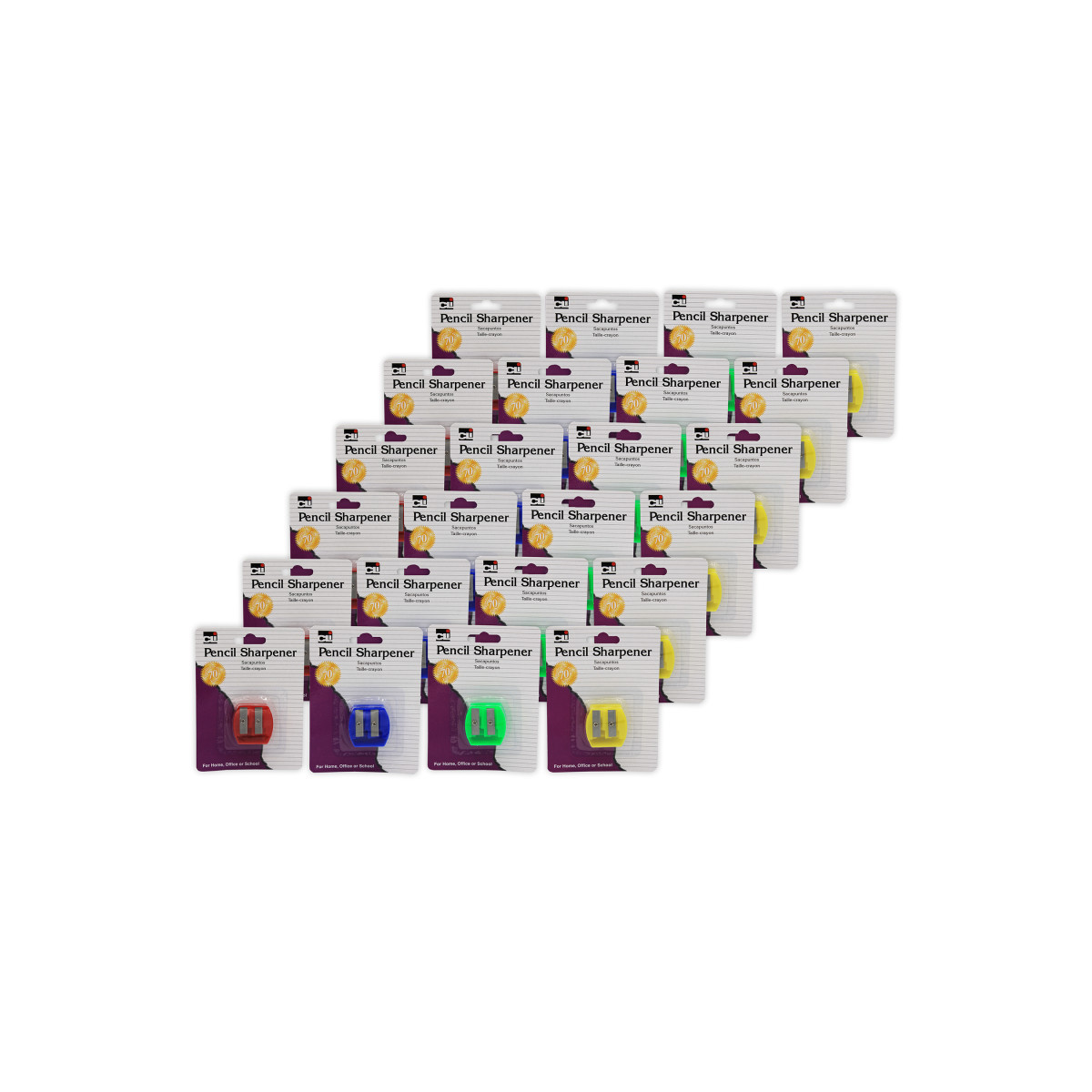 The 2-hole model sharpens standard, and jumbo size pencils. Sturdy plastic construction with a steel blade, sharpens cleanly and effectively. Sold as a pack of 24 in assorted colors (no color choice): Red, Blue, Yellow and Green.
