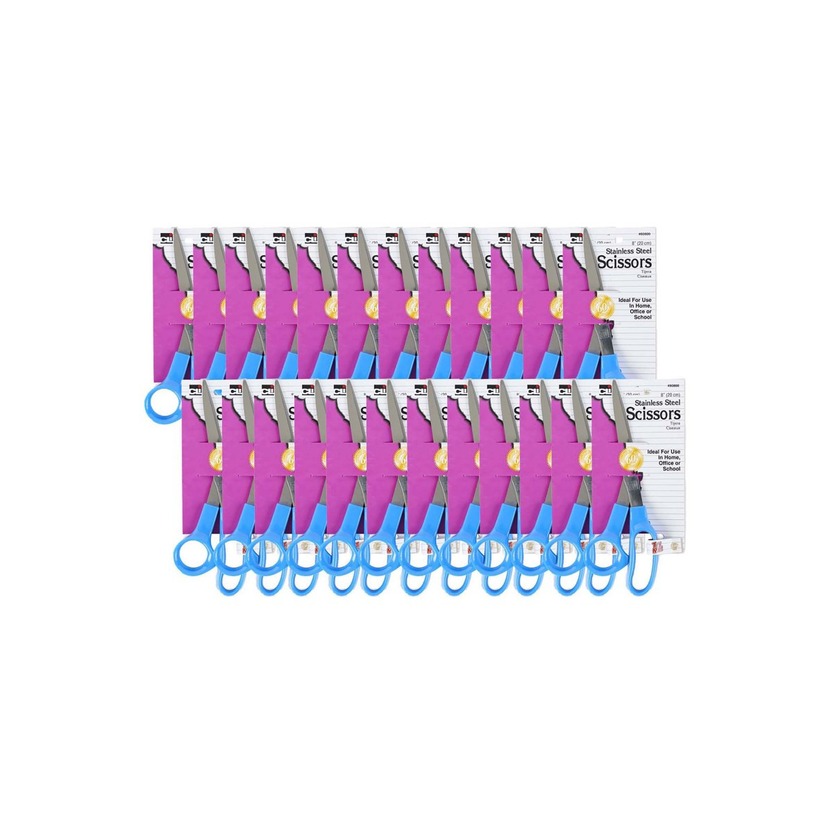These high quality stainless steel scissors feature comfortable molded plastic handles and precision-ground blades for consistently clean cutting. Great for school, home or office. Stainless Steel Scissors with 8 inch straight blade length. Comfortable molded plastic handles. Pack of 24 scissors.