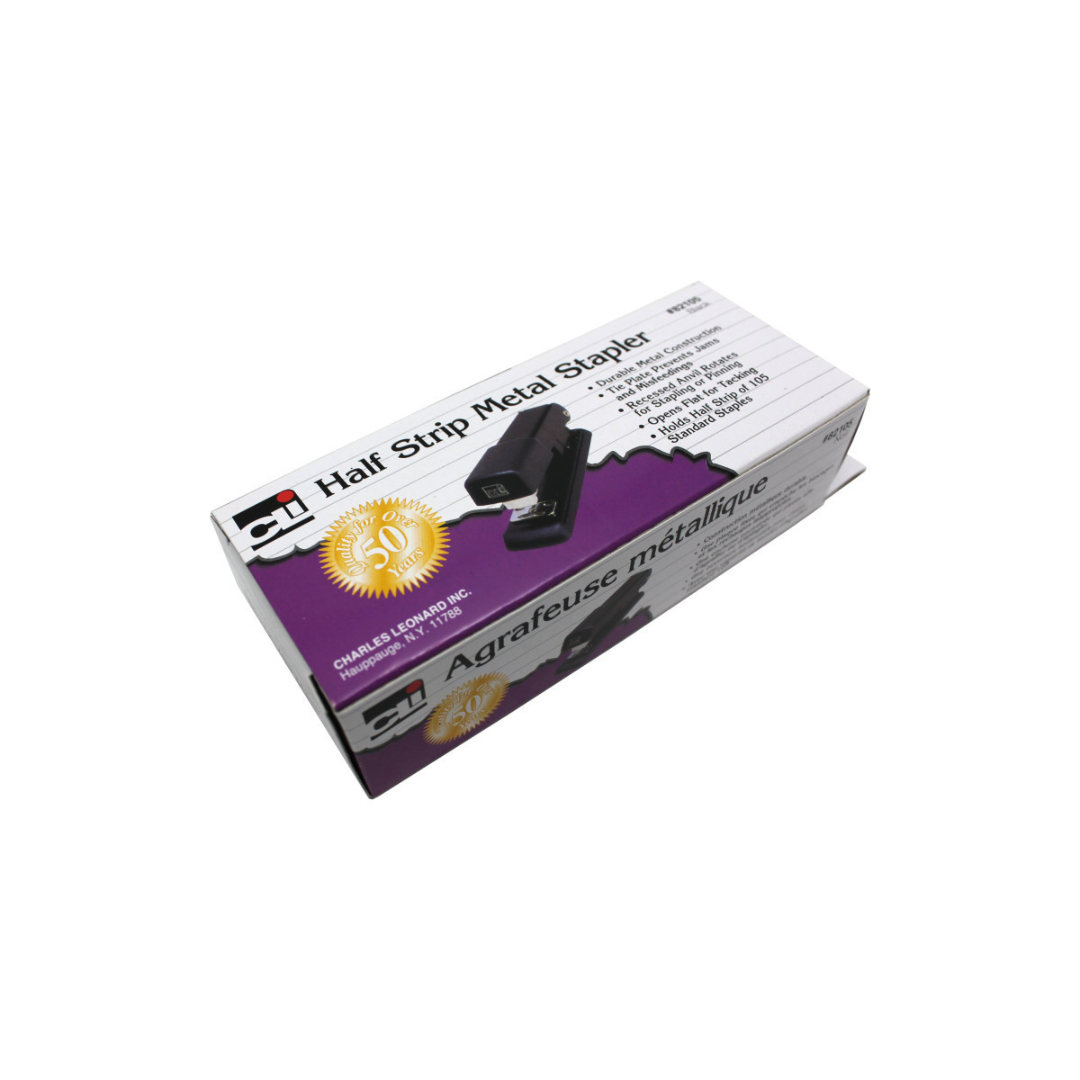 Sturdy metal construction with non-skid base. Rotating anvil for stapling or pinning. Opens for tacking. Open channel loading with reinforced tie plate for consistent performance. Uses standard staples.