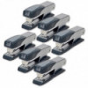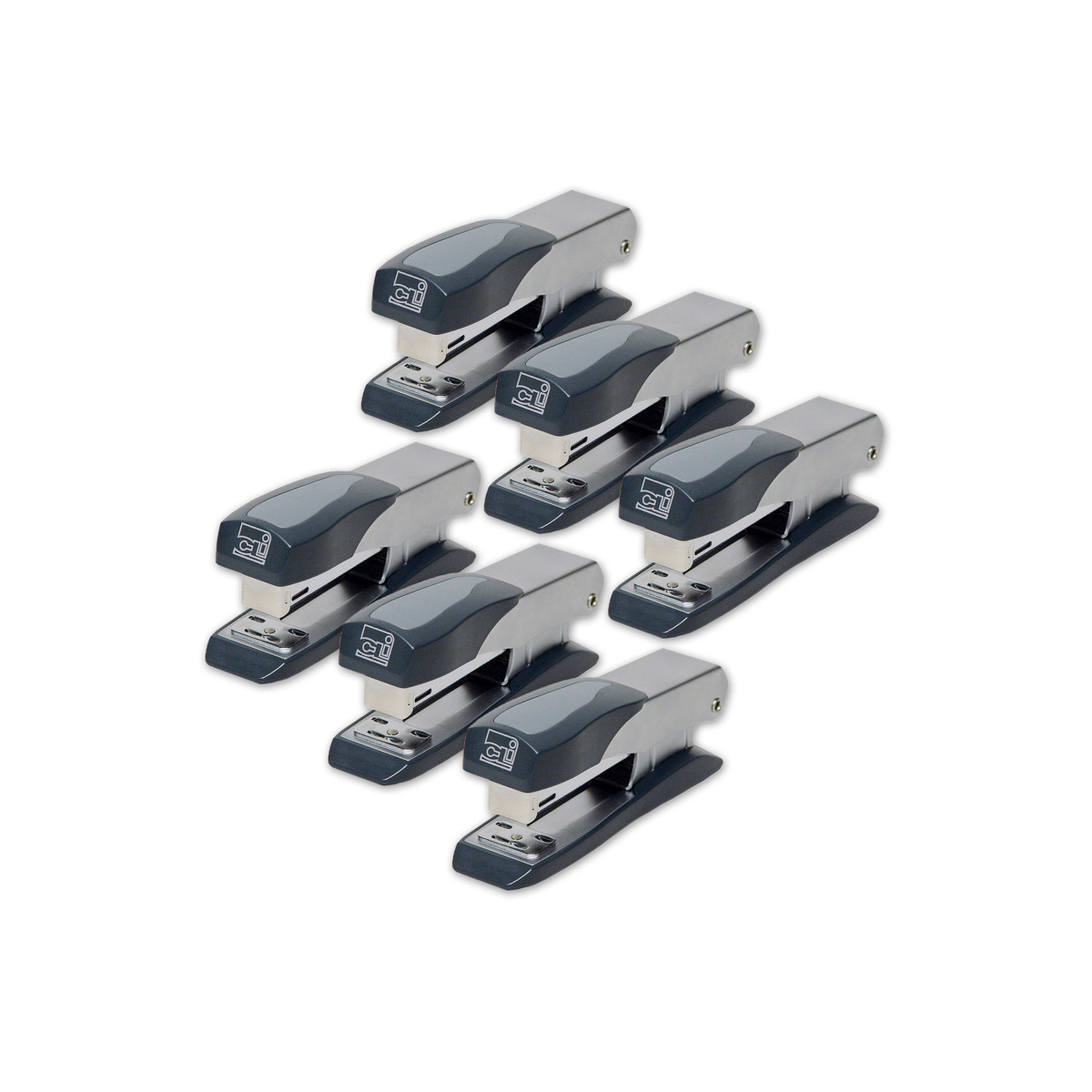 This stapler features a modern design for the office professional. Durable metal construction with non-skid base. Jam resistant mechanism; open channel loading. Rotating anvil for stapling or pinning, also tacks. Uses standard 0.25" staples, half strip. Pack of 6 staplers.