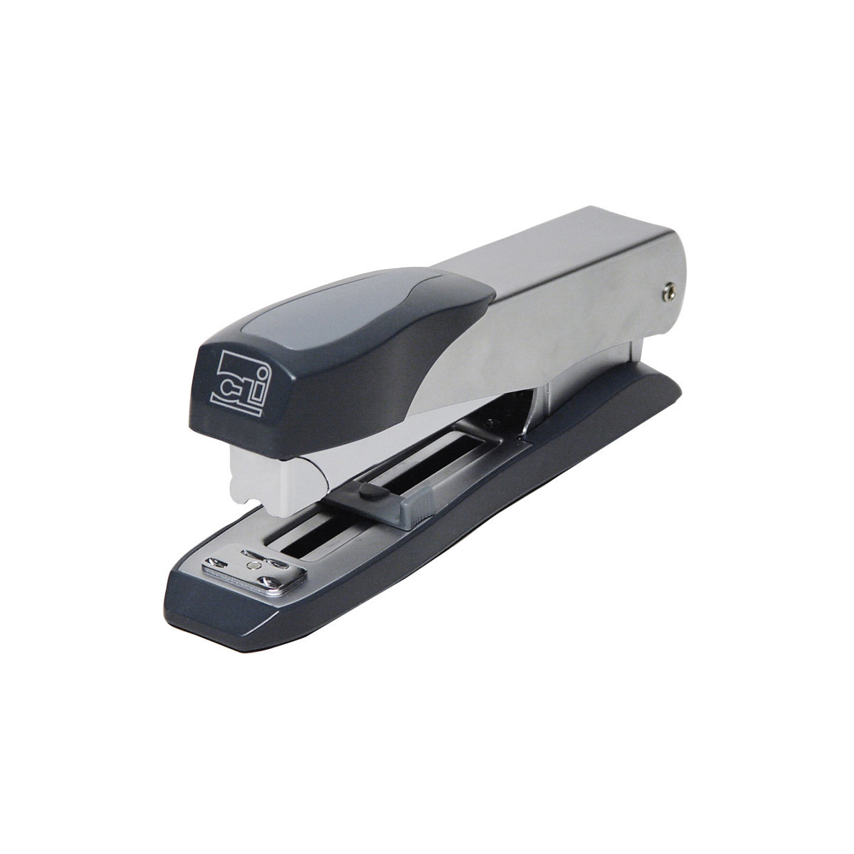 This stapler features a modern design for the office professional. Durable metal construction with non-skid base. Jam resistant mechanism; open channel and push front loading. Rotating anvil for stapling or pinning. Adjustable throat depth of up to 3". Uses standard 1/4" and 5/16" staples, can staple up to 50 sheets. Full strip.