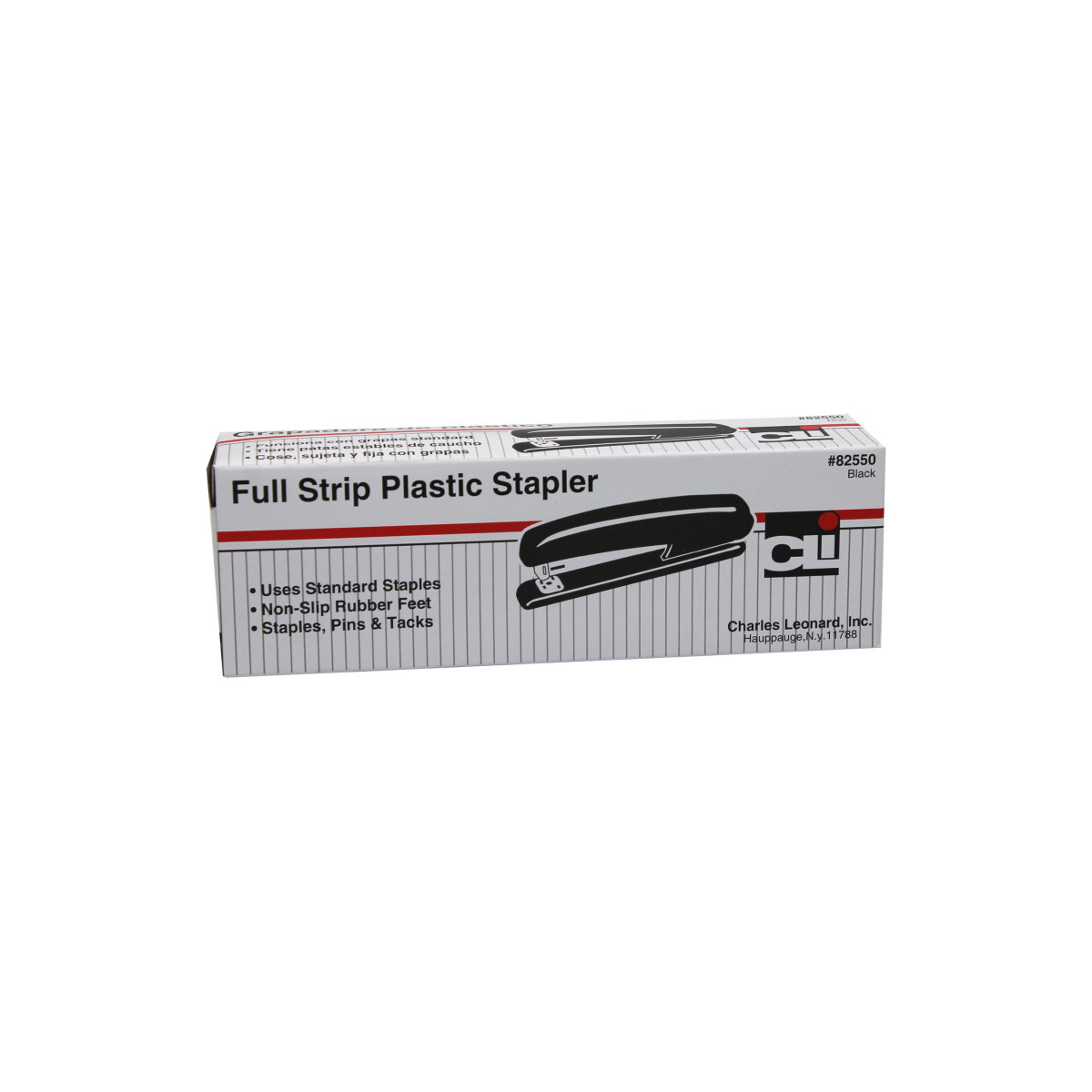 Durable plastic construction houses all metal working parts. Non-skid base and reinforced tie plate. Rotating anvil for stapling and pinning. Secures open for tacking. Uses standard staples.