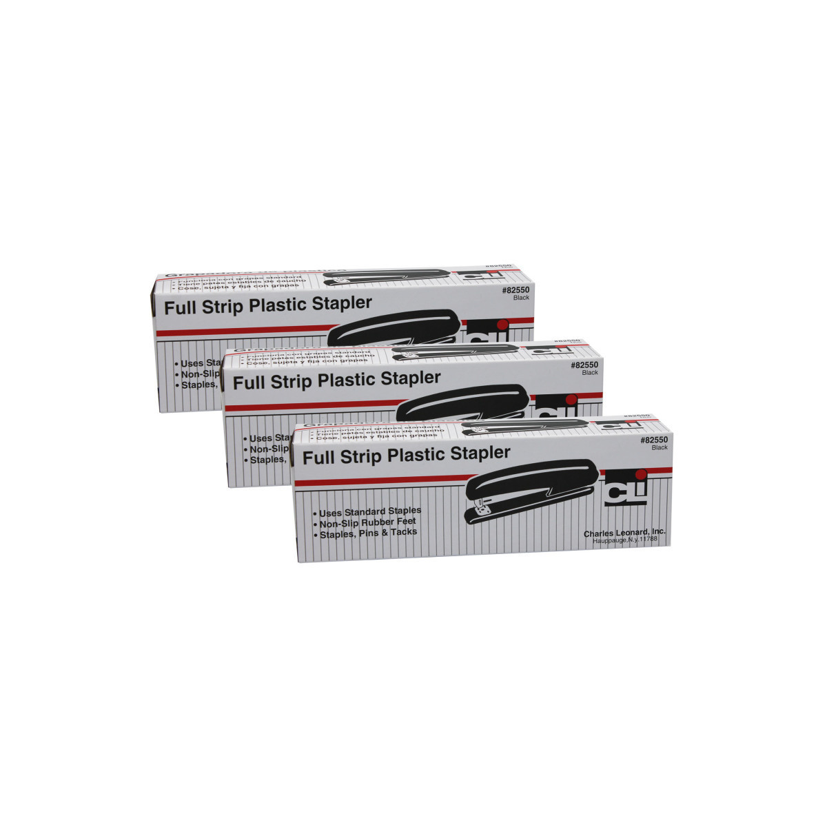 Durable plastic construction houses all metal working parts. Non-skid base and reinforced tie plate. Rotating anvil for stapling and pinning. Secures open for tacking. Uses standard staples. Sold as a pack of 3 staplers.