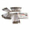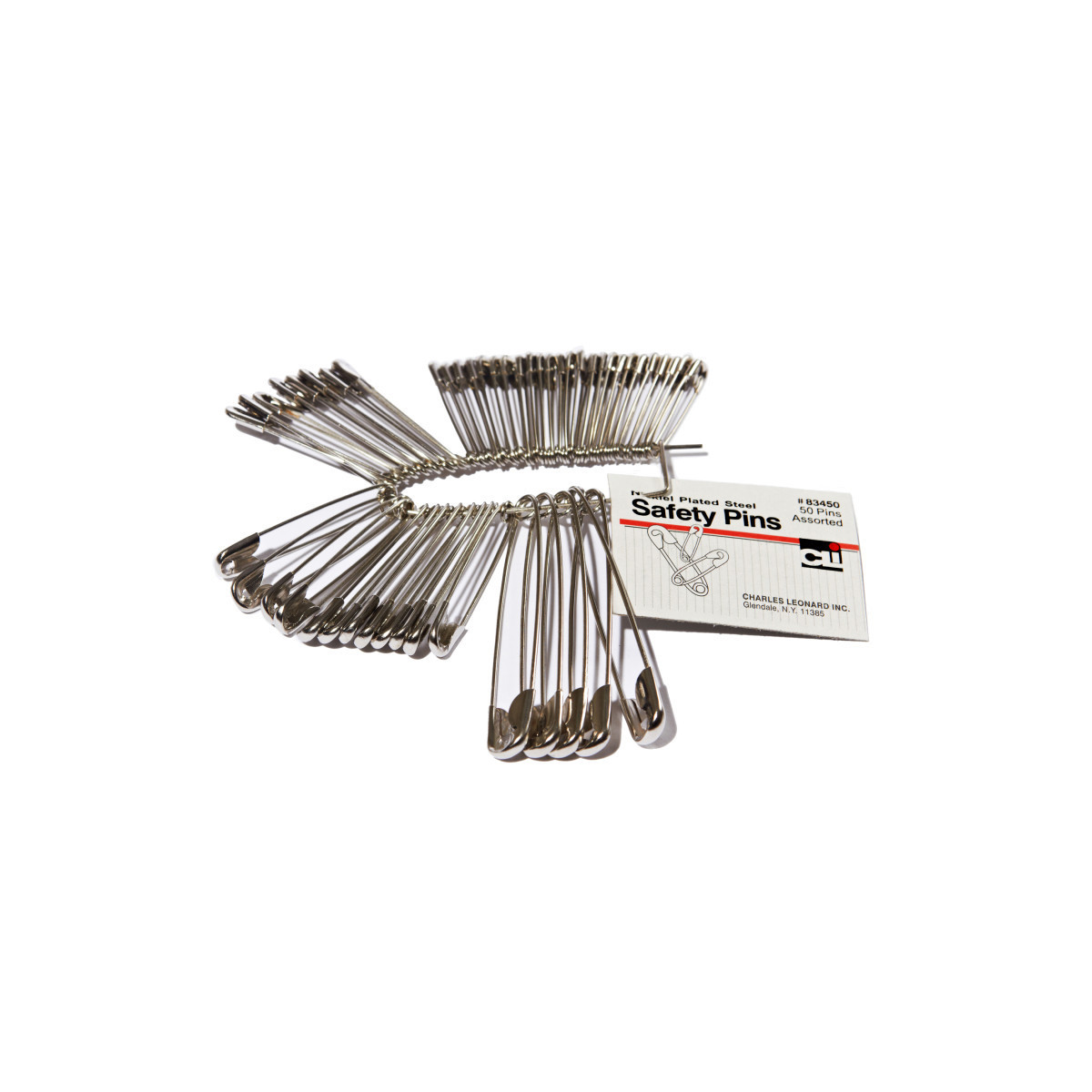 Nickel-plated steel pins with a rust-resistant finish. Features smooth, sharp points for safe and easy penetration. Each pack includes 50 safety pins in assorted sizes.