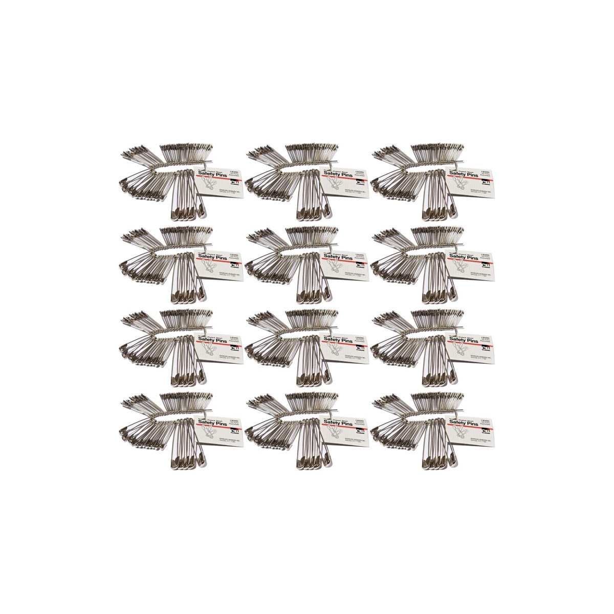 Nickel-plated steel pins with a rust-resistant finish. Features smooth, sharp points for safe and easy penetration. Each pack includes 50 safety pins in assorted sizes. Sold as 12 packs for a total of 600 pins.