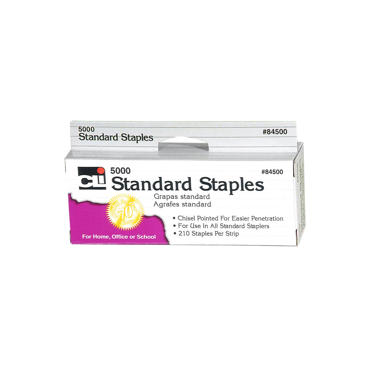 High-quality, precision-made staples fit all standard size staplers. Chisel-pointed for sure entry. 210 per strip, 5000 per box. Convenient hand tab box.