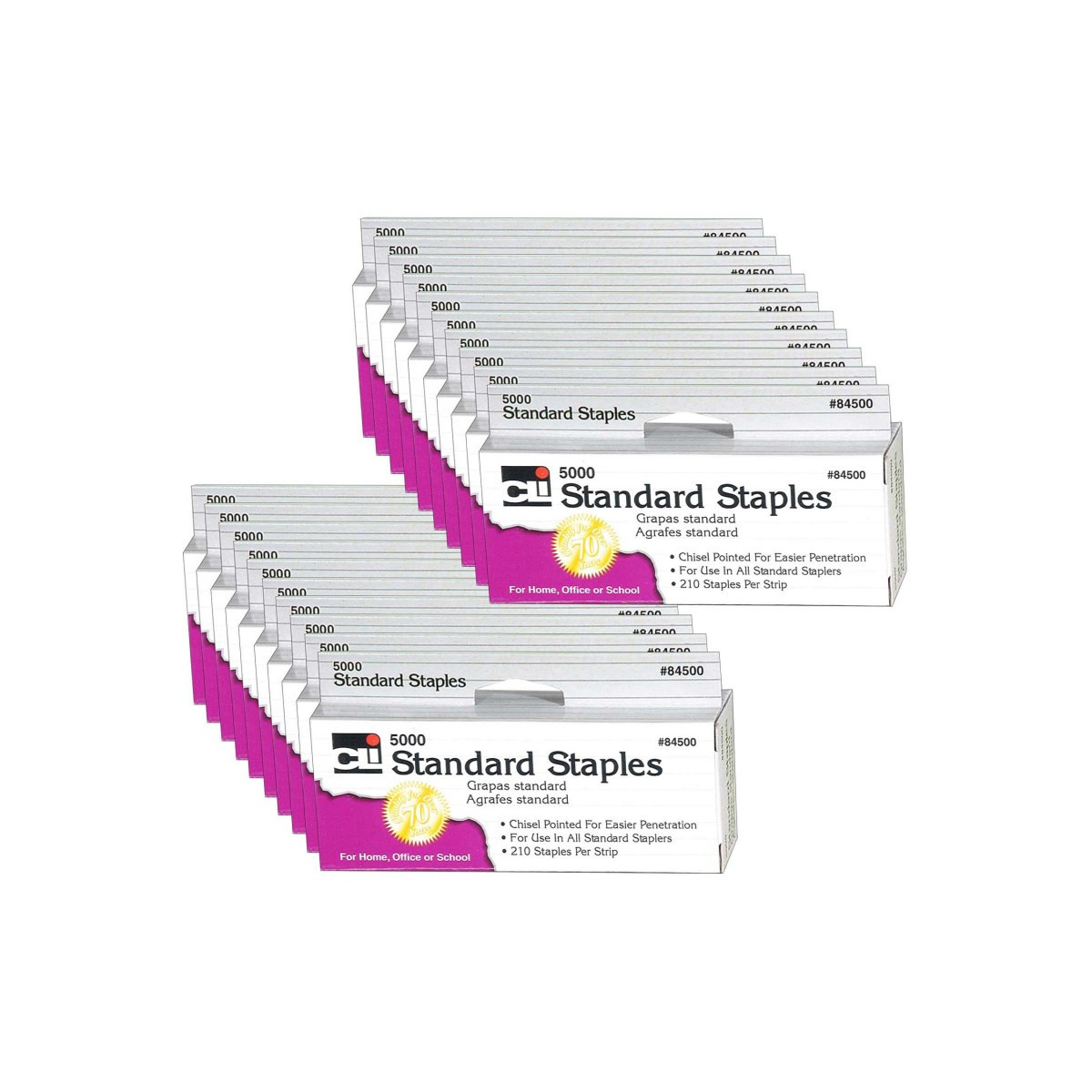 High-quality, precision-made staples fit all standard size staplers. Chisel-pointed for sure entry. 210 Staples per strip. Convenient hand tab box. Each box includes 5000 staples. Sold as 20 boxes for a total of 100,000 staples.