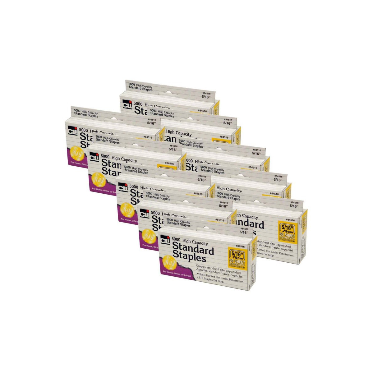 Precision-made staples are high-quality and high capacity. Staples measure 5/16" with a 50 sheet capacity. Specifically made to be used in high capacity staplers. Chisel-pointed for sure entry. Each box includes 5000 staples, 210 per strip. Convenient hand tab box. Sold as 10 boxes for a total of 50000 staples.