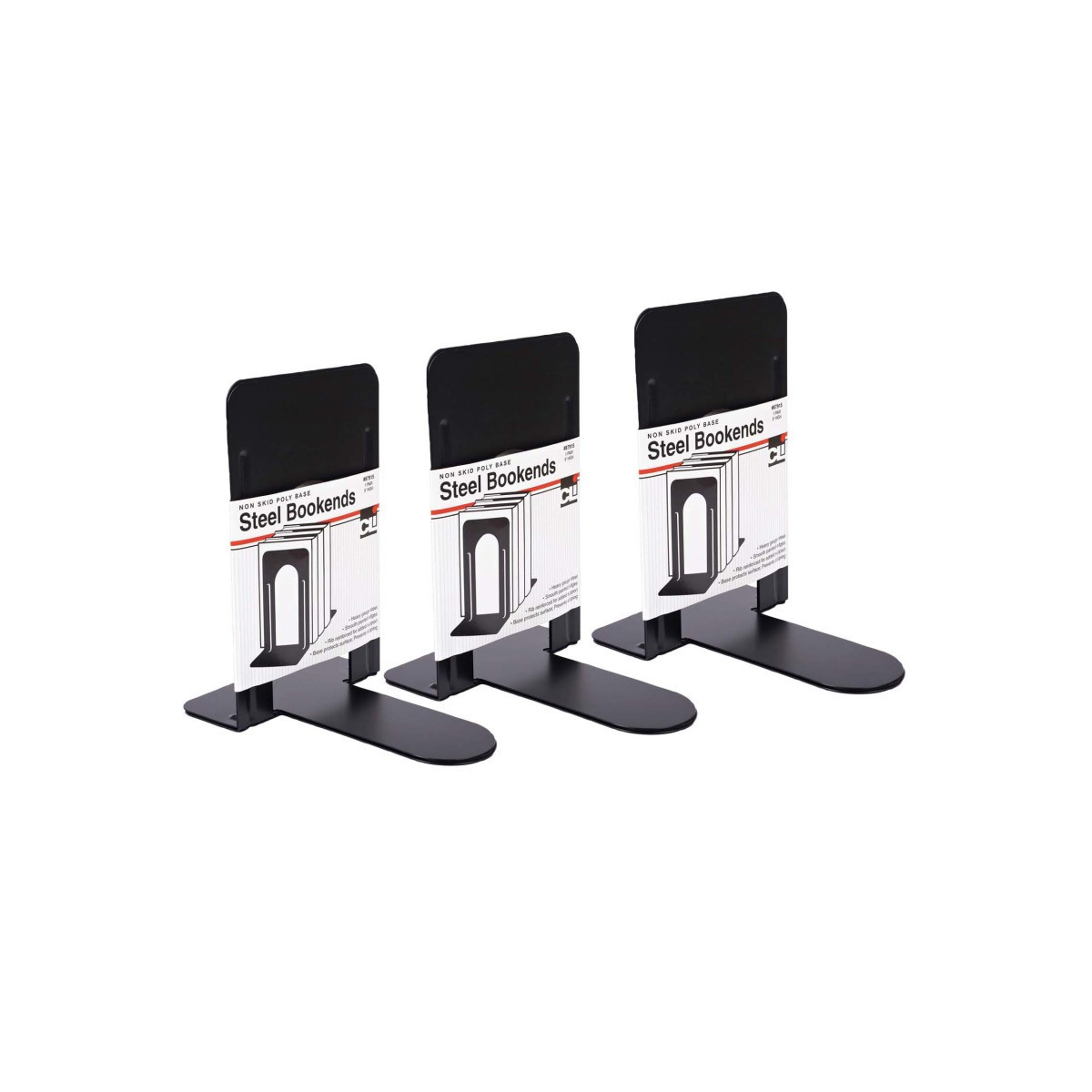 Heavy gauge steel with reinforced ribbing. Smooth coined edges provide extra safety. Comes with a non-skid poly base, which prevents slipping and scratching. 9" height. Each pack includes 2 bookends. Sold as 3 packs for a total of 6 bookends.