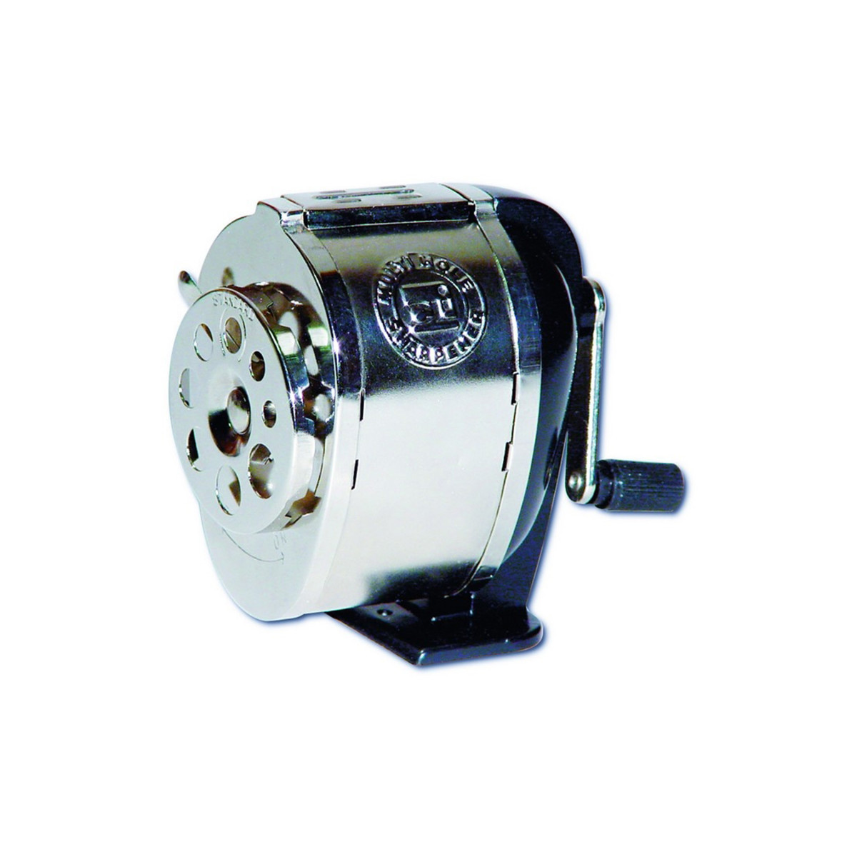 Heavy-duty pencil sharpener features rugged steel construction with nickel-plated receptacle. Solid steel cutters and gears automatically stop when pencil is sharp. Pencil grooves fit 8 different size pencils. Mounting screws included.