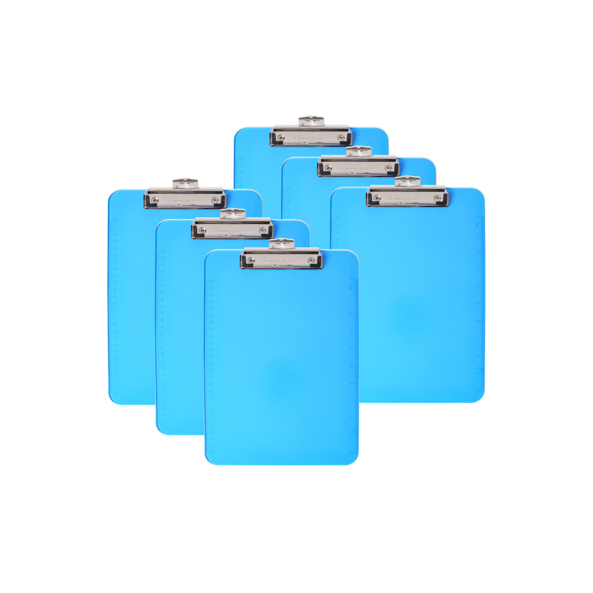 Clipboards are made of tough, durable injection molded plastic and feature smooth edges. Low profile clip with rubber grips holds paper securely. Pull-out hook allows for hanging. Clipboard also features a 12" ruler on the edge, inches on one side and centimeters on the other. Pack of 6 clipboards.