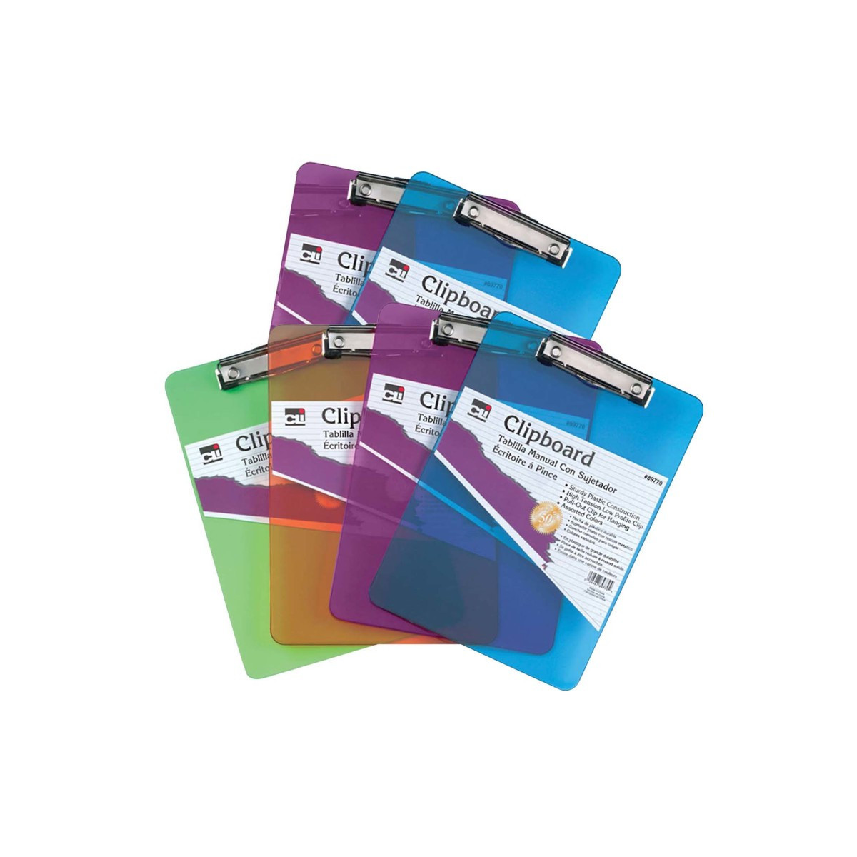Tough, durable injection molded plastic with smooth edges. Low profile clip with rubber grips holds paper securely. Pull-out hook for hanging. Contemporary transparent colors (no color choice). Clipboard also features a 12" ruler on the edge, inches on one side, centimeters on other side. Letter size. Pack of 6 clipboards.