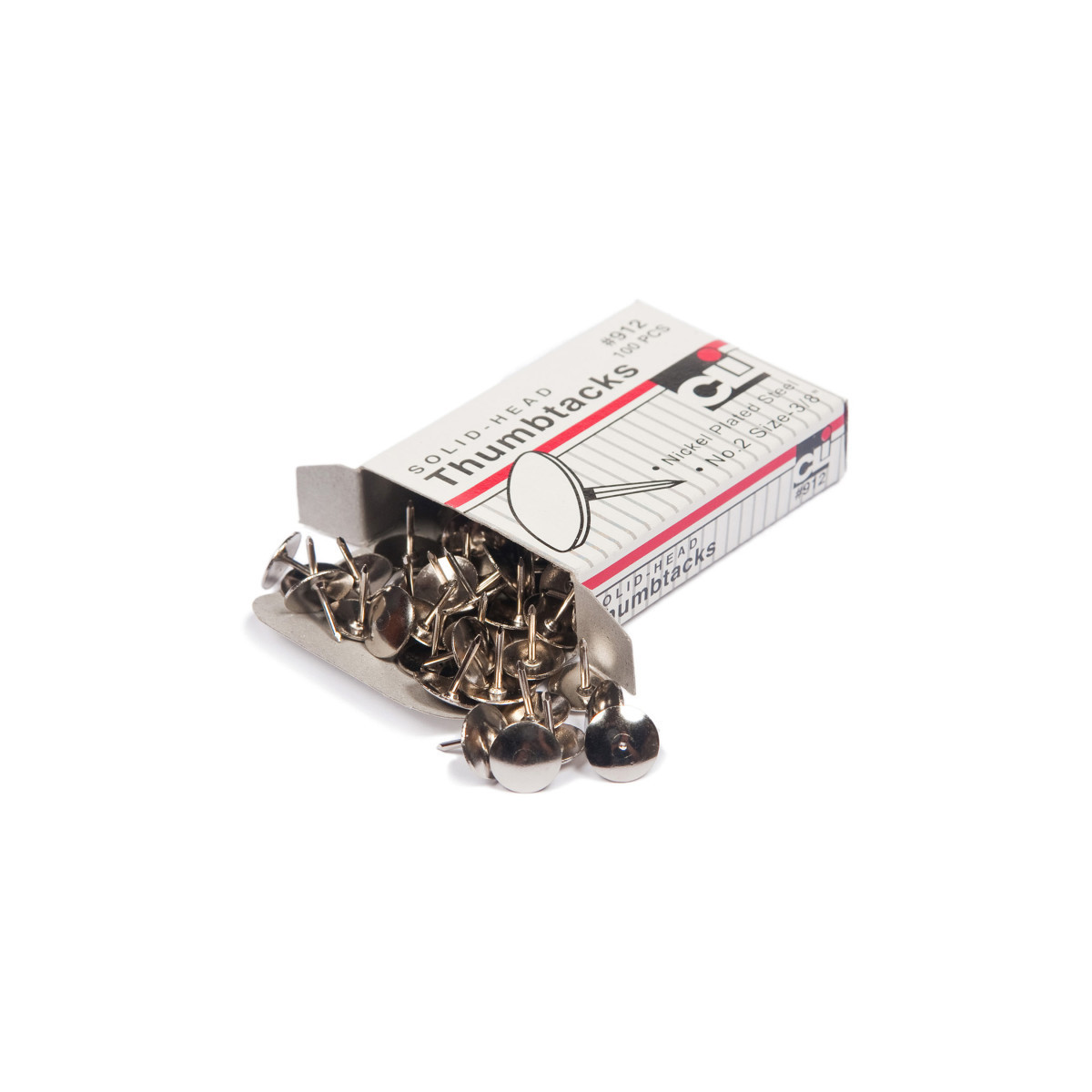 Charles Leonard Solid-Head Thumb Tacks feature a smooth, solid head to insure safety and comfort. The nickel-plated steel thumb tacks have a 5/16" sharpened steel pin, and a 3/8" head (#2 size). Each box includes 100 thumb tacks.