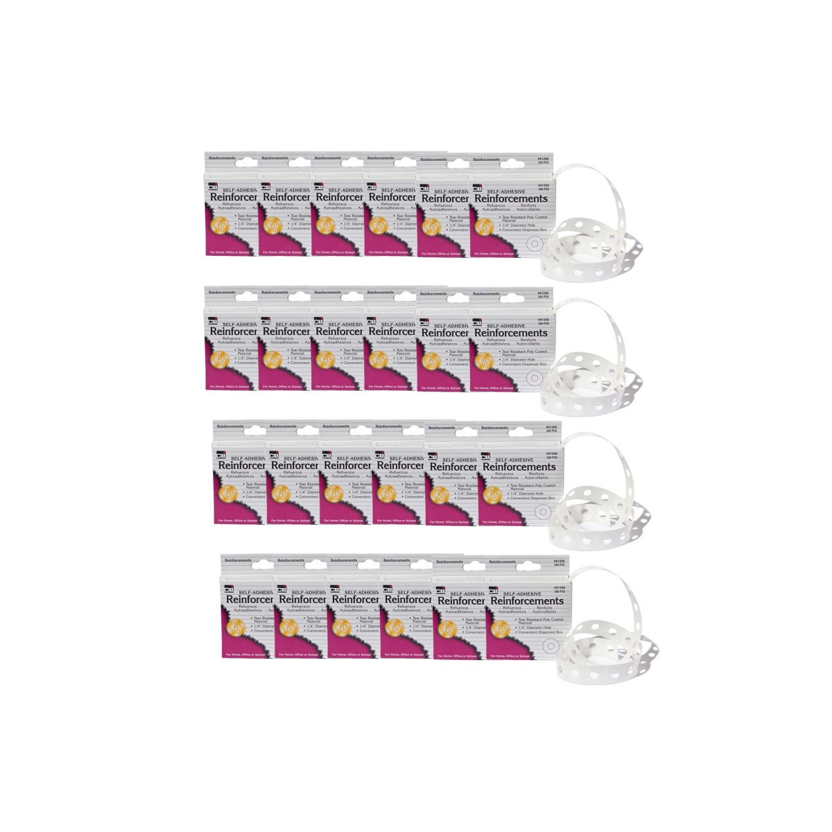 Ideal for securing 3 hole punched paper. Removable self-sticking labels are easy to peel off. Come in a convenient dispenser box. Easy peel off. Permanent. Each pack includes 200 labels. Sold as 24 packs for a total of 4800 reinforcements.