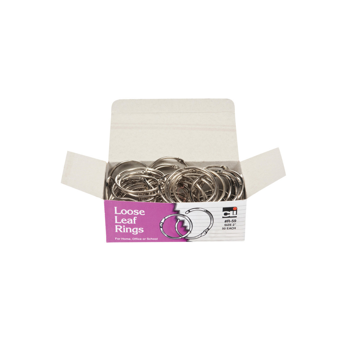 Versatile rings feature precision snap lock closures. Ideal for samples, swatches, loose-leaf material and more. Bright nickel-plated rings are rust-proof. Rings measure 2" diameter. Each box includes 50 rings.
