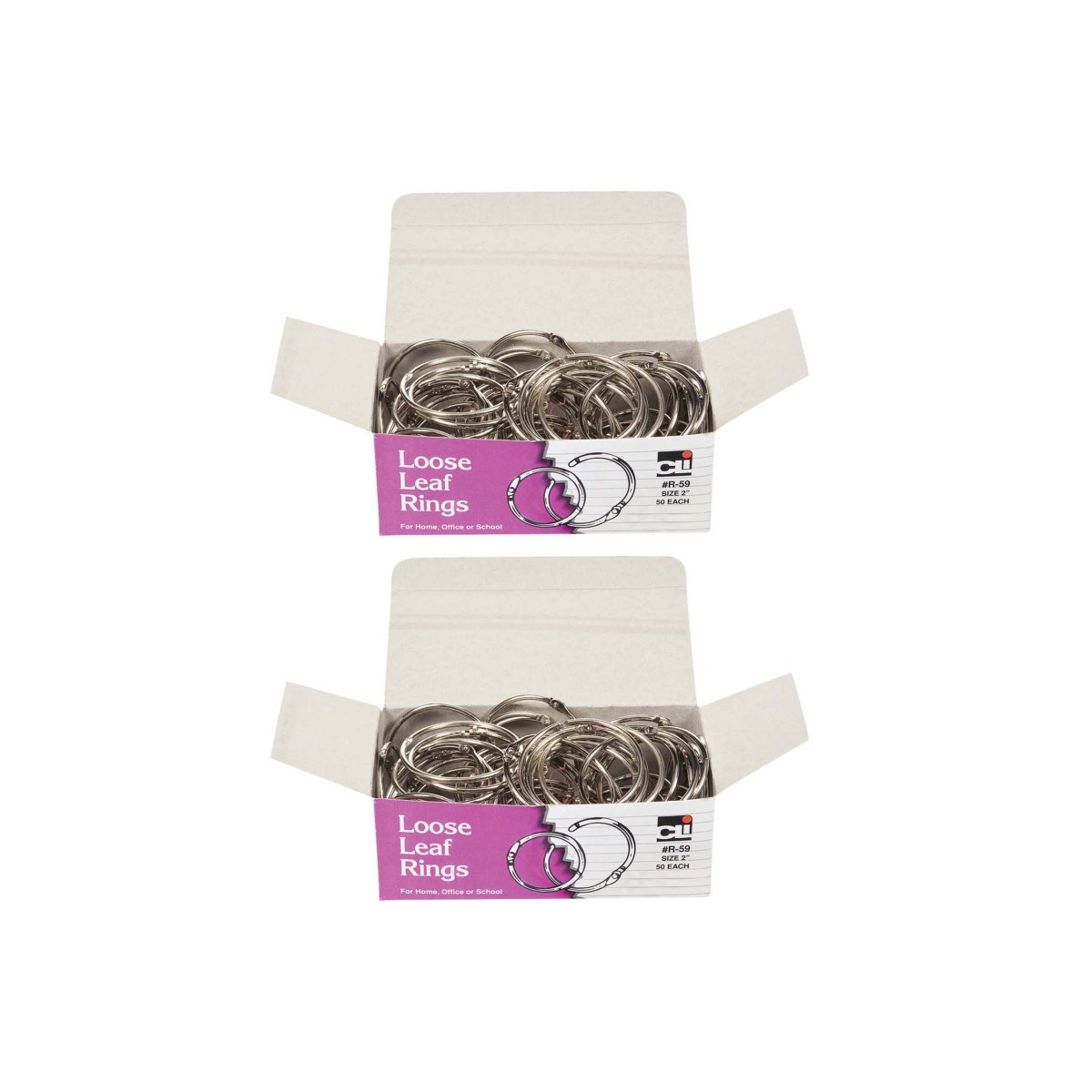 Versatile rings feature precision snap lock closures. Ideal for samples, swatches, loose-leaf material and more. Bright nickel-plated rings are rust-proof. Rings measure 2" diameter. Each box includes 50 rings. Sold as a set of 2 boxes, 100 rings total.