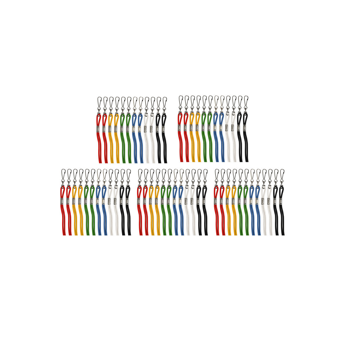 Securely fasten your whistle or name badge with the Champion Sports Heavy Duty Nylon Lanyard. Great for keeping your items close and secure, these lanyards feature a metal J-hook for quick and easy attachment. Each pack includes 12 lanyards in assorted colors: black, royal blue, yellow, green, scarlet and white. Sold as 5 packs, 60 lanyards total.