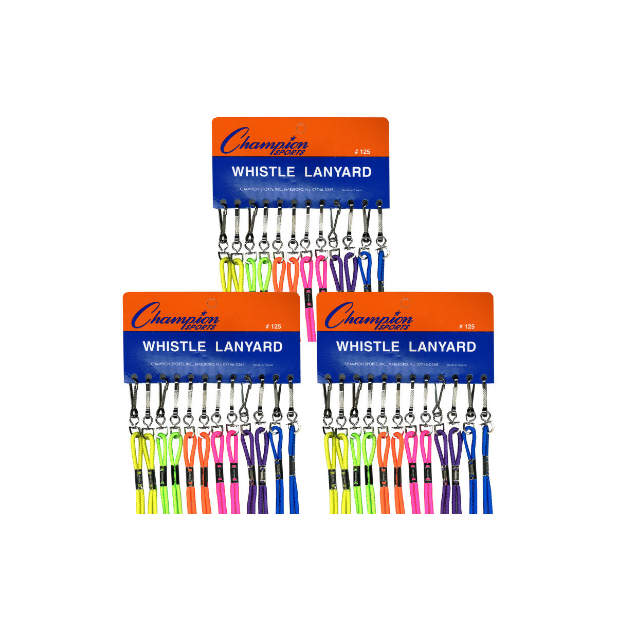 Securely fasten your whistle or name badge with the Champion Sports Heavy Duty Neon Nylon Lanyards. Great for keeping your items close and secure, these lanyards feature a metal J-hook for quick and easy attachment. Each pack includes 12 lanyards in assorted neon colors: Royal Blue, Green, Pink, Orange, Purple and Yellow. Sold as 3 packs for a total of 36 lanyards.