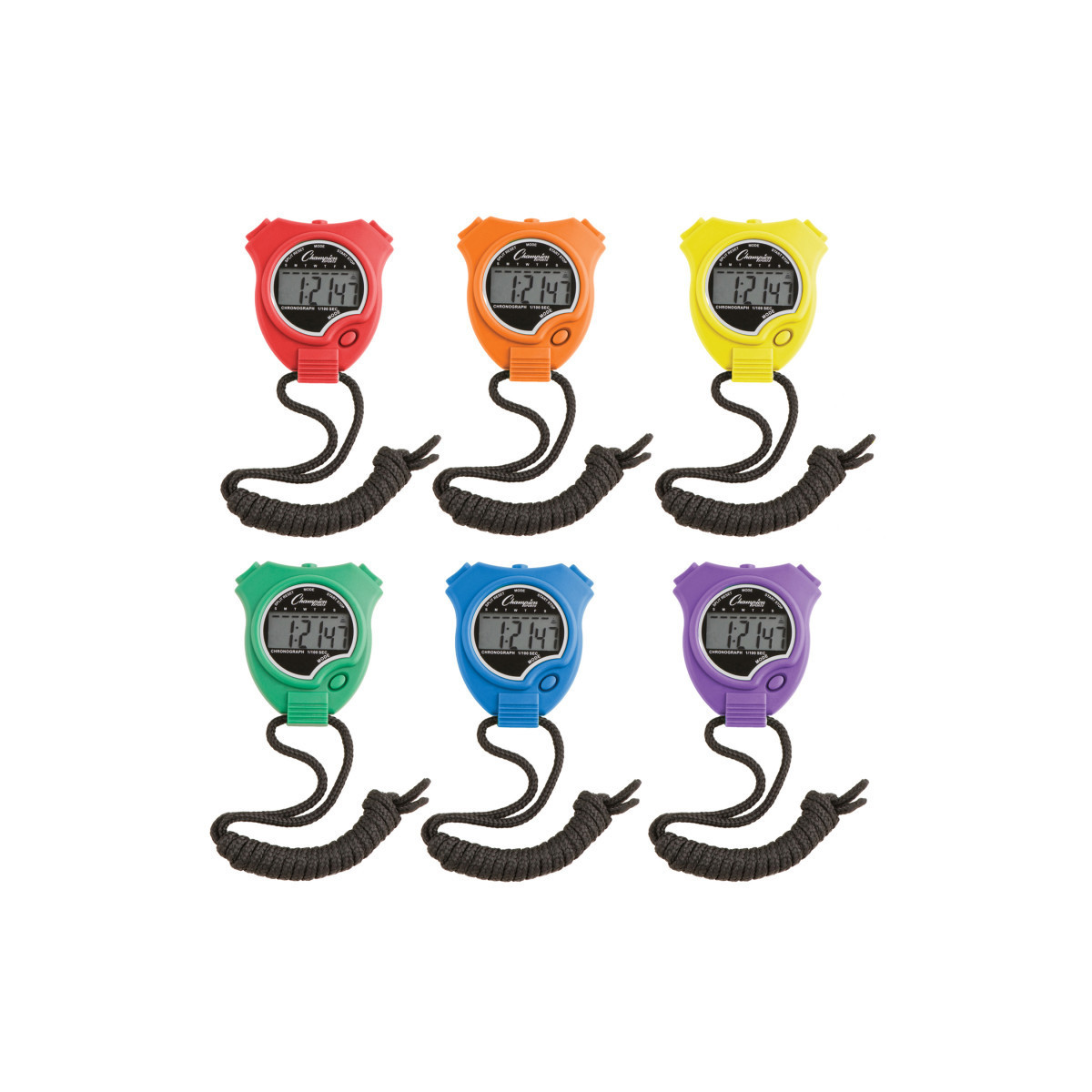 The Champion Sports Stopwatch Set is easy-to-use and packed with features. The large digital display includes 1/100 of a second precision, a lap counter, and 12 or 24 hour formats. Other useful features include calendar and time display, a daily alarm, and an hourly chime. It is also water and shock resistant, so you can train hard without worry. This set of six stopwatches comes with one each of red, orange, yellow, green, blue and purple.