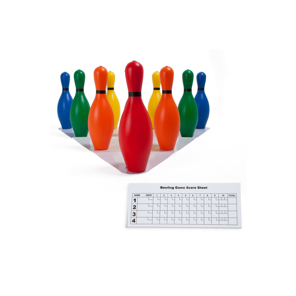 The Champion Sports Multi-Color Bowling Pin Set is fun for everyone to bowl safely indoors or outdoors. This set includes ten weighted, colorful plastic bowling pins, a set up sheet, and score pad.