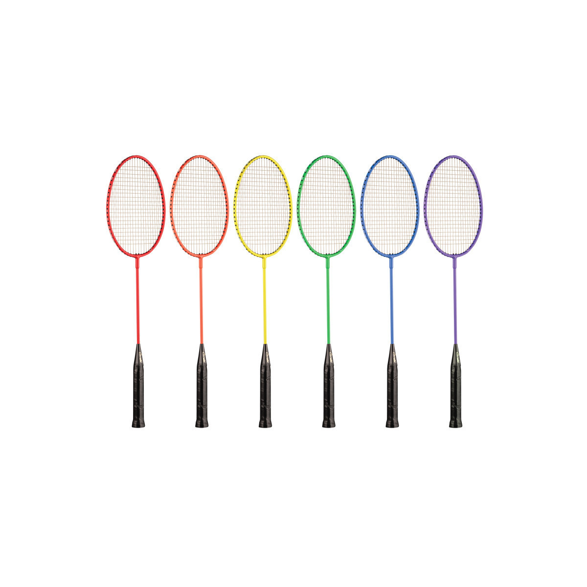In a sport like badminton, a racket with the right grip, balance, string tension and weight can provide a player with that extra flexibility or control needed to be a champion. Champion Sports offers a wide variety of rackets for every need. This badminton racket set of 6 features an all steel shaft and frame, heavy-duty nylon strings, and a dimpled leather grip. The Tempered Steel Shaft & Frame Set comes in 6 colors: Red, Orange, Yellow, Green, Blue, and Purple.