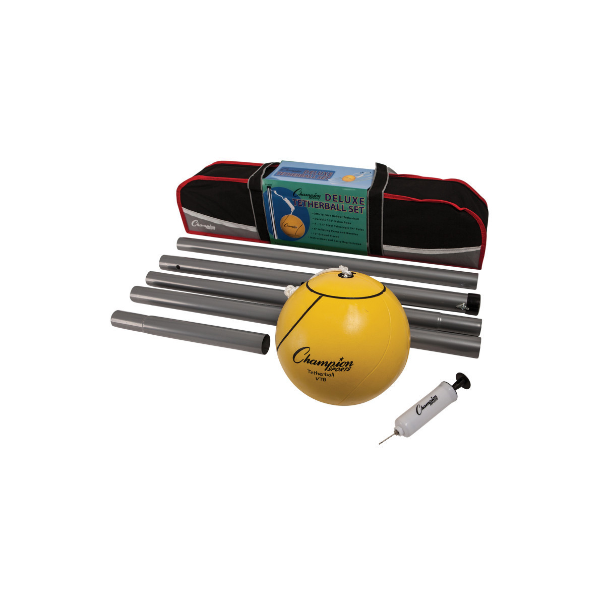The Champion Sports Deluxe Tetherball Set has everything you need to set up a game of tetherball at the park, campsite, or even at the beach. This tetherball set includes a regulation ball, three 1.5" steel telescopic 24" long poles, durable 102" nylon rope, 6" inflating pump and needles, 12" ground sleeve, handy carrying bag with inner box, and instructions. The telescopic pole easily adjusts so players of all heights and ages can enjoy the game.
