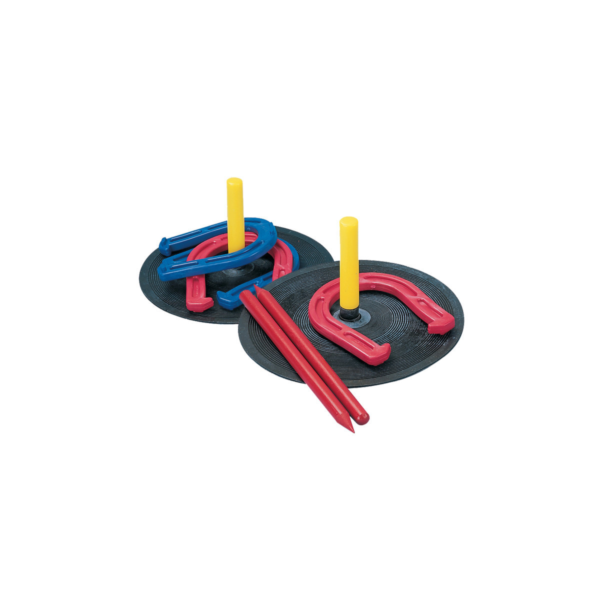 - Set includes: 4 rubber horseshoes, 2 rubber mats with yellow pegs, and 2 red plastic dowels
