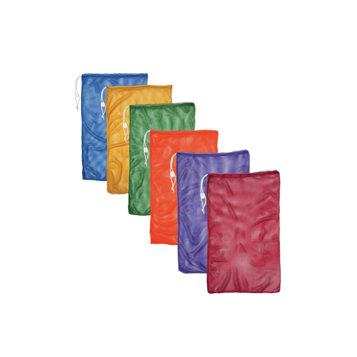 The Champion Sports Mesh Equipment Bag Set can be used to carry sports gear and balls. The nylon-mesh design allows wet gear to dry quickly and keeps loose items secure. Each bag features a drawstring cord, lock, and ID tag. This set of six bags includes one each in gold, green orange, purple, blue and scarlet. Measures 36"L x 24"W.