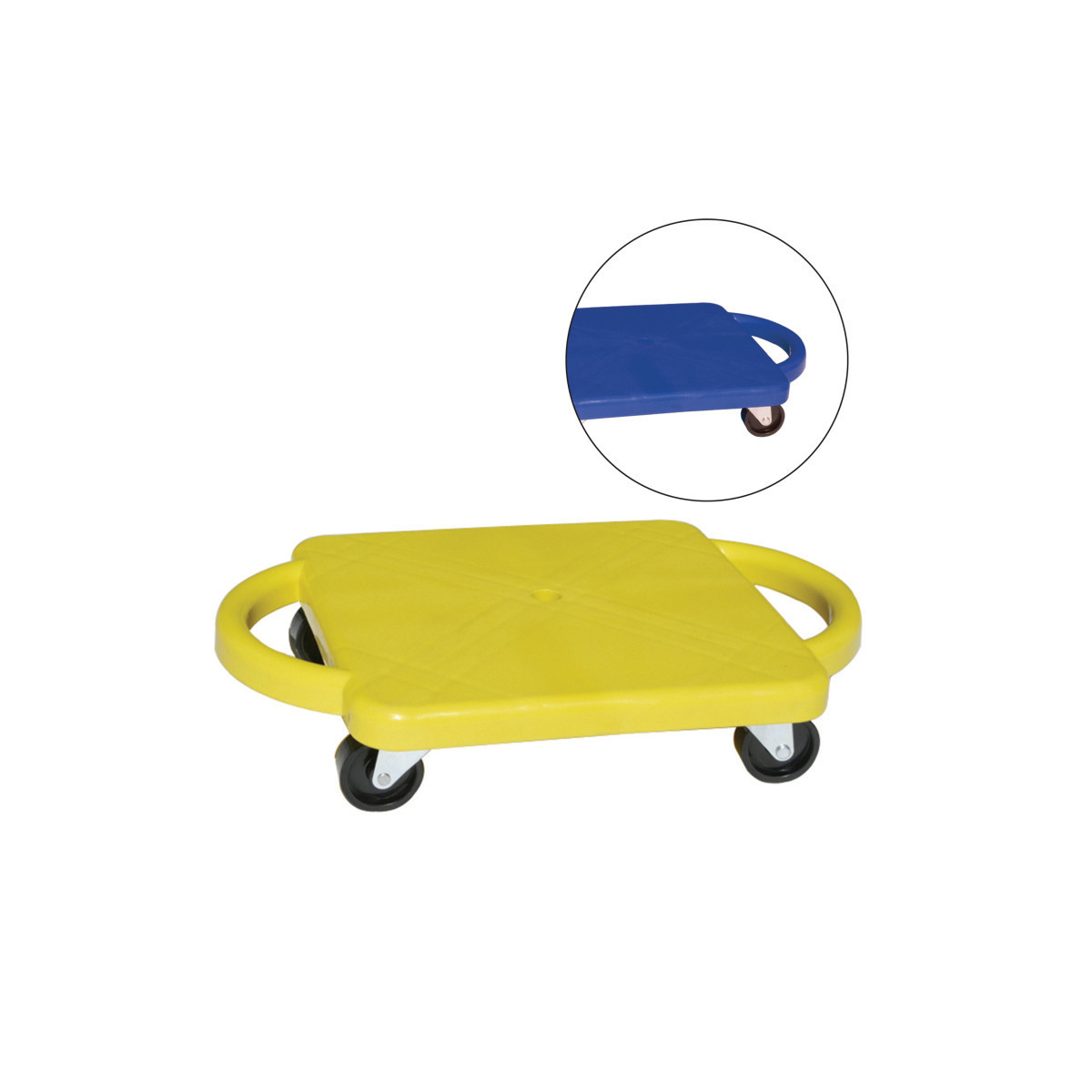Whether it's a game of scooter hockey or a group scooter train, the Champion Sports Plastic Scooter with Handles offers plenty of fun for the gym or playground. The scooter has non-marring plastic casters that won't markup indoor floors and handles for extra stability. Equipped with a wide 12" x 12" base, the scooter can be used while sitting, kneeling or in a prone position for a variety of games and activities. This 12" plastic scooter feature easy grip handles and non-marring swivel casters. Sold in Blue or Yellow (no color choice).