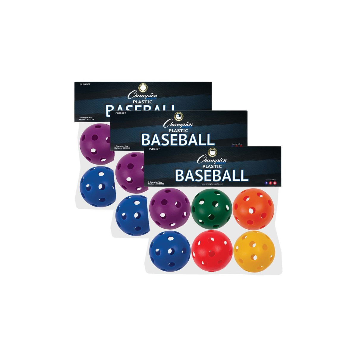 Kids will have a blast playing catch or working on their pitching with the versatile Champion Sports Plastic Baseball Set. Great for everything from gym class to recreational activities, these hollow plastic baseballs are a safe option for young children to play with, economical, and light enough for a student to carry the whole bag out from storage with ease. This convenient plastic baseball set features six vibrant colors that are easy to spot against the grass, ground and pavement when it's time to clean up. Each set includes 6 balls. Sold as 3 sets for a total of 18 balls.