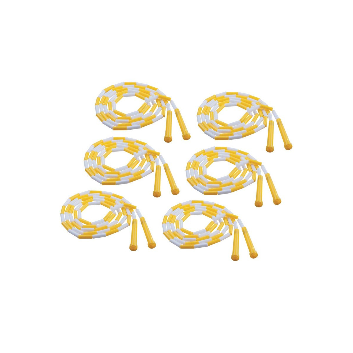The Champion Sports Segmented Jump Rope provides a fun recreational or P.E. activity for kids, and great cardiovascular and fitness benefits for adults! The sound of the beads hitting the floor helps teach rhythm, and these ropes are available in a variety of lengths to accommodate all jumpers. Plastic segmented. Size: 8'. Yellow/White. Sold as a pack of 6 Jump ropes.