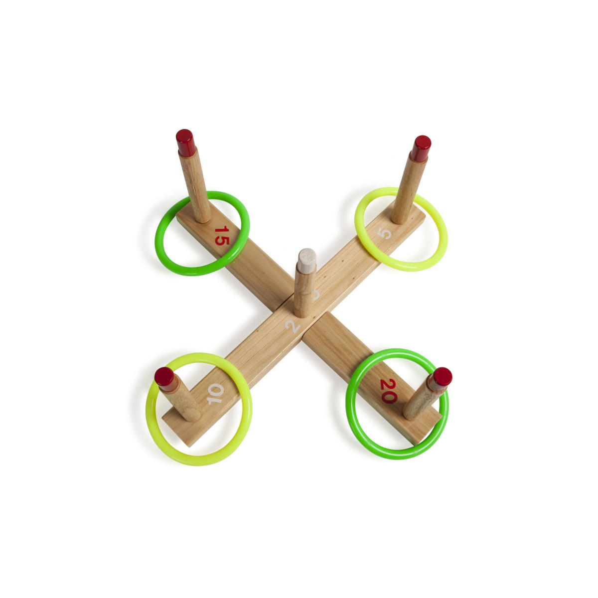 Set includes: wooden base, 5 pegs, 2 red rings and 2 blue rings