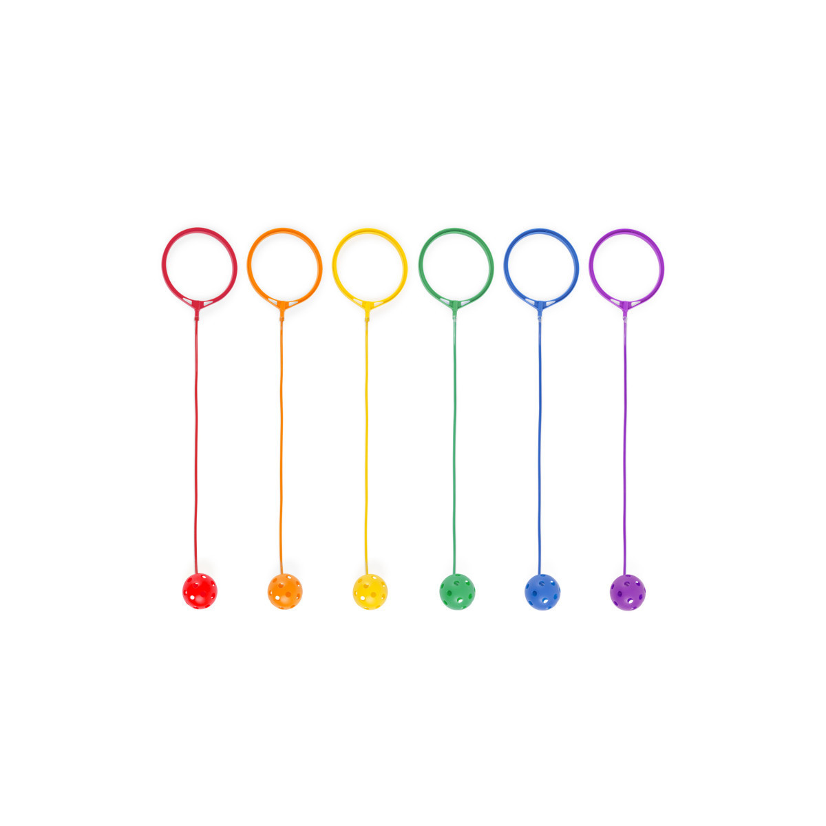 The Champion Sports Swing Ball Set offers a fun cardio exercise for kids and adults that can be played alone or competitively in a group. Simply slip your foot through the ring and start swinging the corded ball with your ankle; the aim is to keep jumping over the ball and cord without missing a jump or stepping on the cord. Made of durable plastic; this set of six swing balls is easy to use, clean and maintain. Cord is 18" Long and is durable but gentle on legs for added safety. Ankle ring is 5.5" Diameter slips over most feet easily. Set of 6 (1 of each) Green, Orange, Purple, Red, Royal Blue and Yellow
