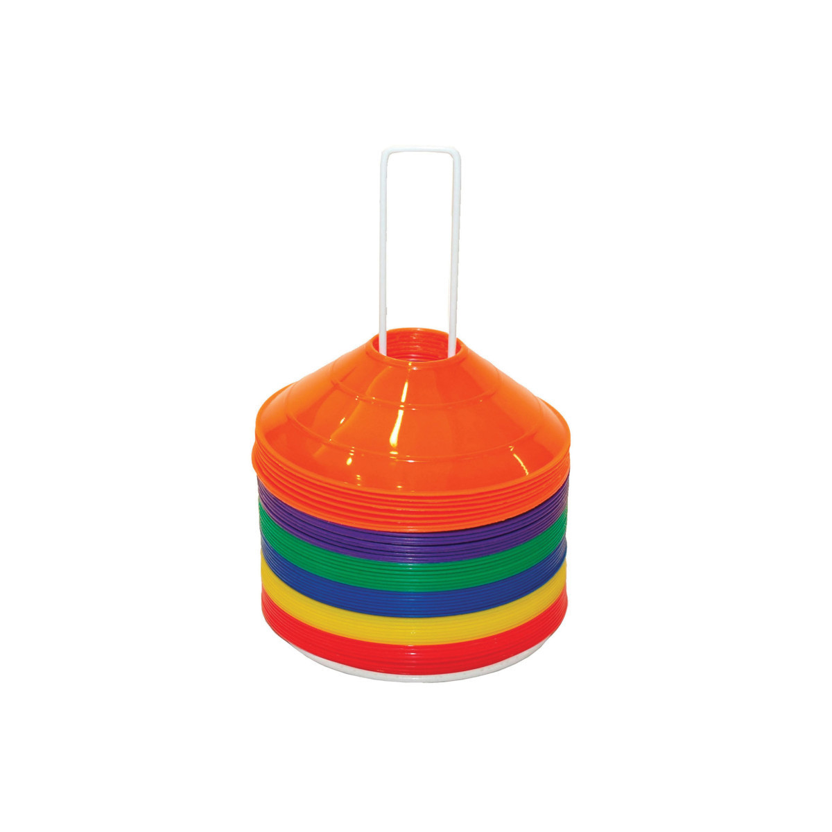 The Champion Sports Saucer Field Cone Set is a versatile tool for just about every sport. Use these 9" low profile cones to set up an obstacle or agility course, or to mark boundaries on a field. The set includes eight each in red, orange, yellow, green, blue and purple, on a wire cone carrier.