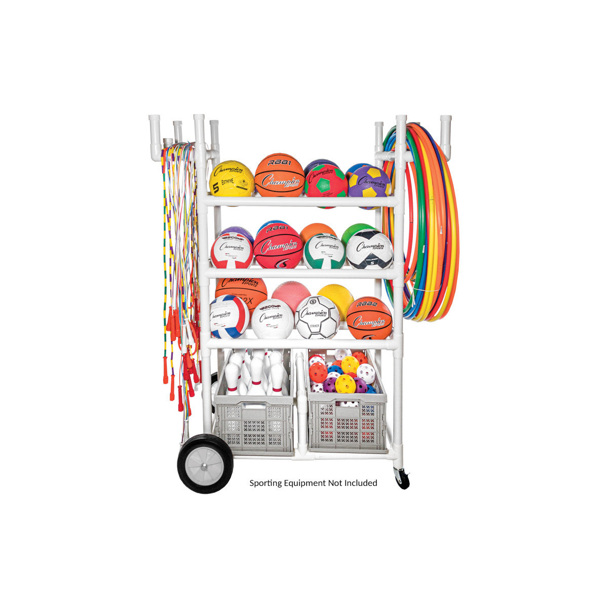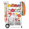 Holds up to 24 balls, jump ropes, hoops and other accessories