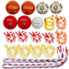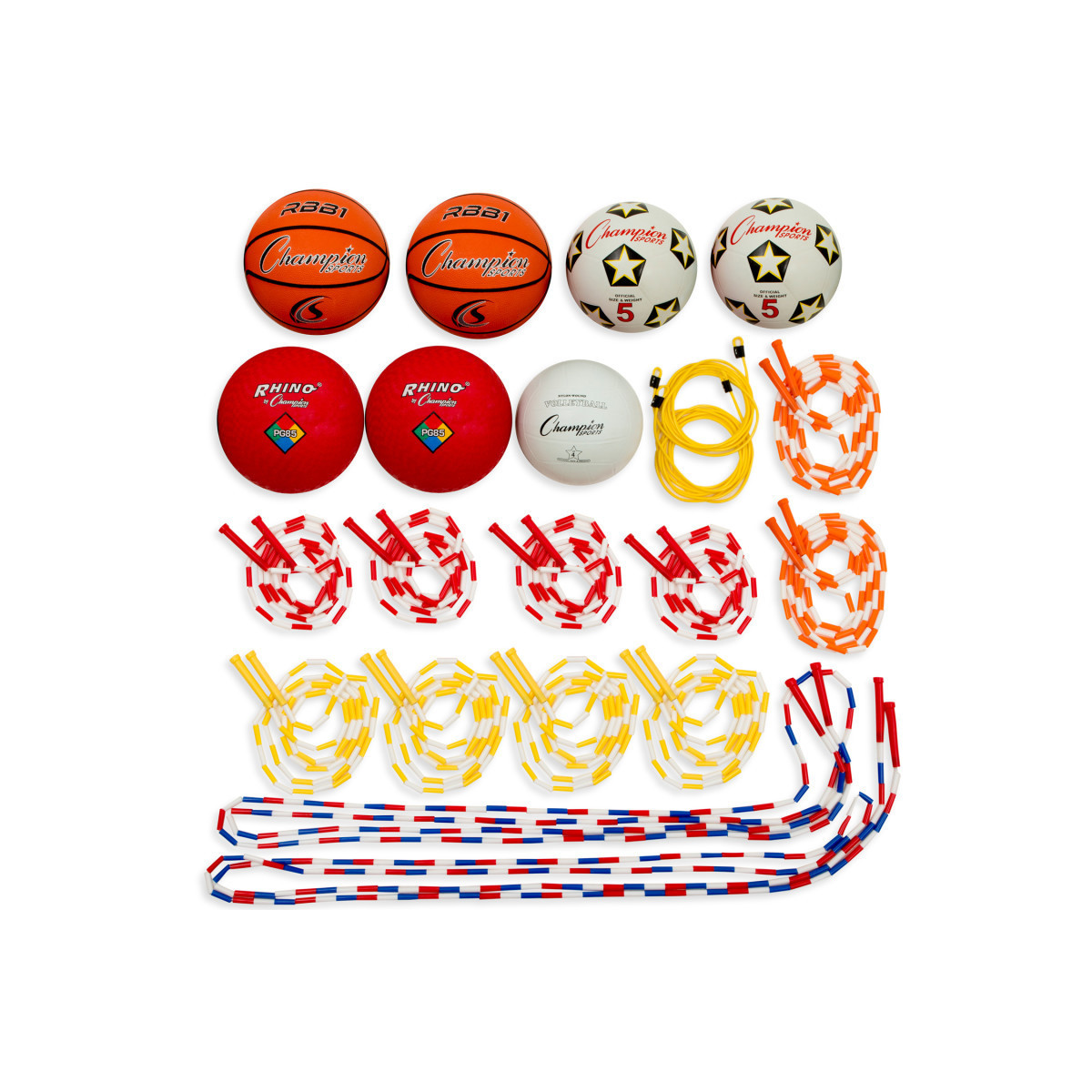 Provides the equipment for basketball soccer kickball dodge ball volleyball and other games in one simple package. Offers a seemingly endless combination of games and exercises. Perfect for use during practice for warm-ups or even for game time. Set includes a volleyball, two 8.5" diameter playground balls, two soccer balls, two basketballs, two 10" jump ropes, two 12" jump ropes, two 16" segmented jump ropes, four 7" segmented jump ropes and four 8" segmented jump ropes.